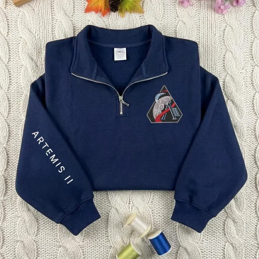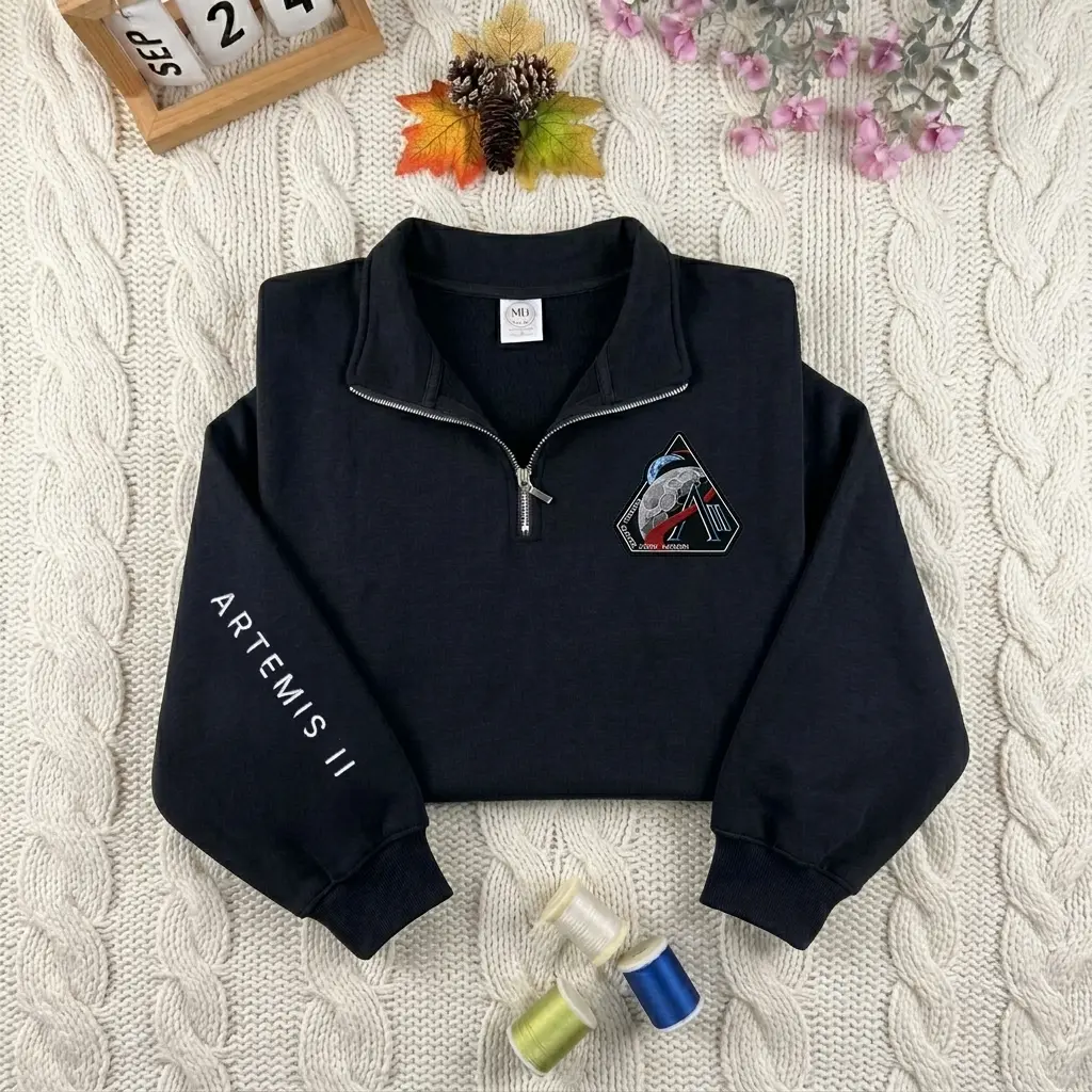 NASA Artemis II Embroidered Quarter Zip Sweatshirt, Moon Mission Patch Hoodie, Space Lover Gift, STEM Science Crewneck, Minimalist Astronaut Sweater
