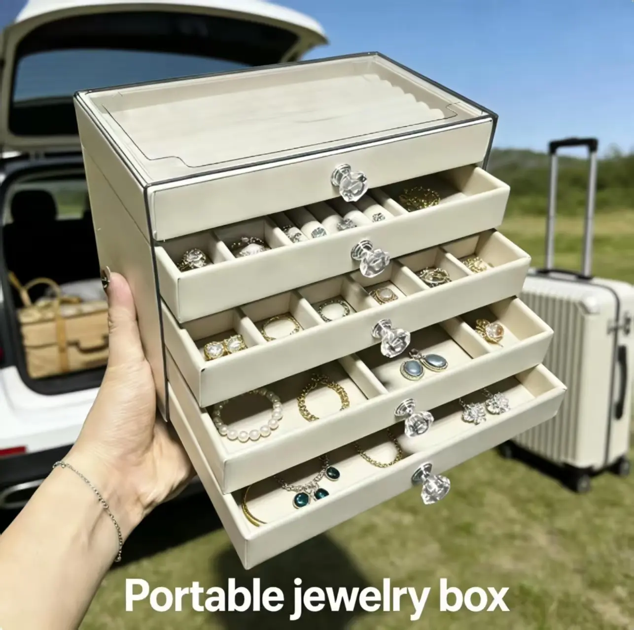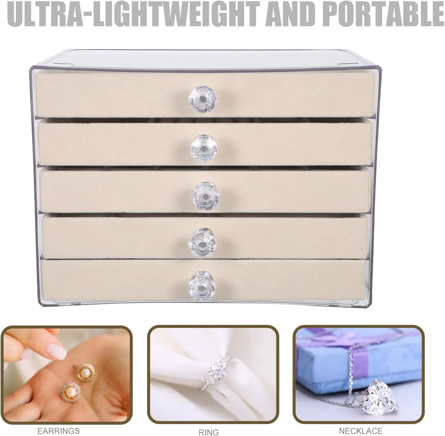 Five-Layer Large Capacity Storage Featuring five pull-out drawers with different internal layouts, this organizer provides ample space for all your treasures. From rings and earrings to necklaces and chunky bracelets, the logical partitioning helps you declutter your space and keep your jewelry tangle-free