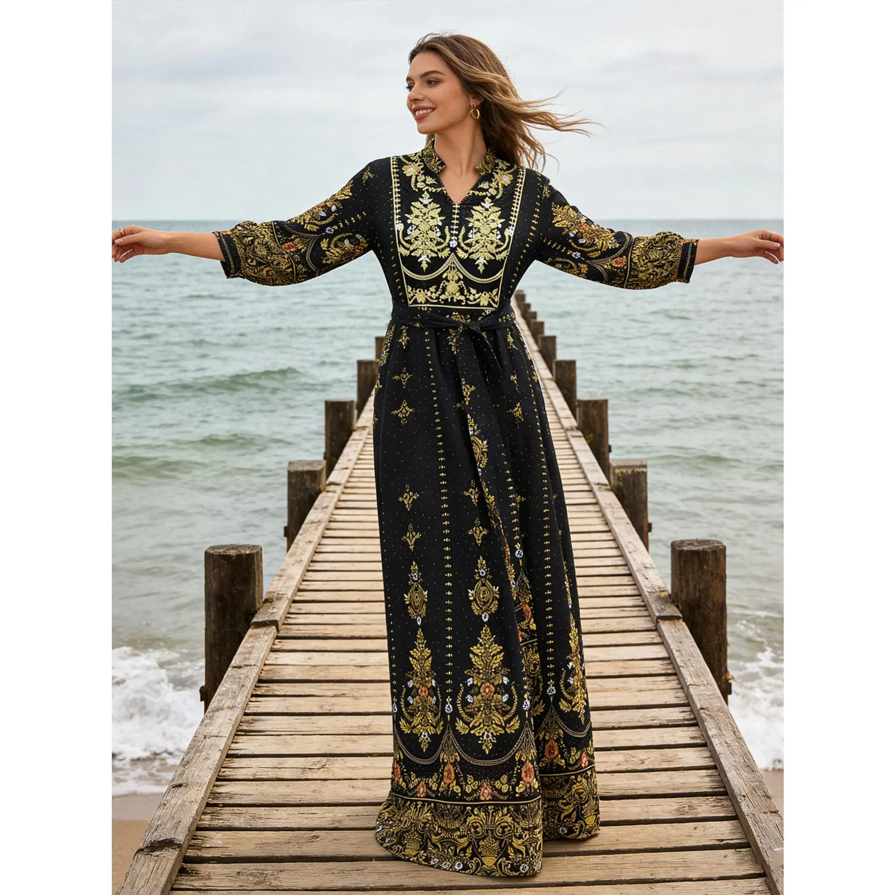 This breathtaking gown features a sophisticated baroque-inspired print that exudes elegance and confidence. Designed with a flattering V-neck and a matching belt to cinch your waist, this dress is the perfect blend of high-fashion style and bohemian comfort.