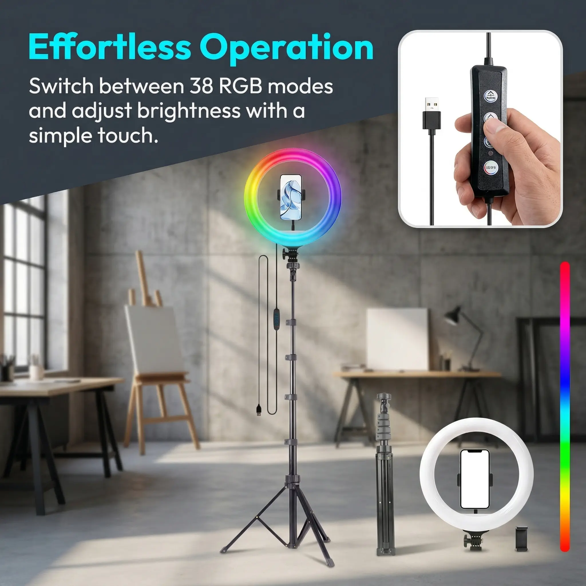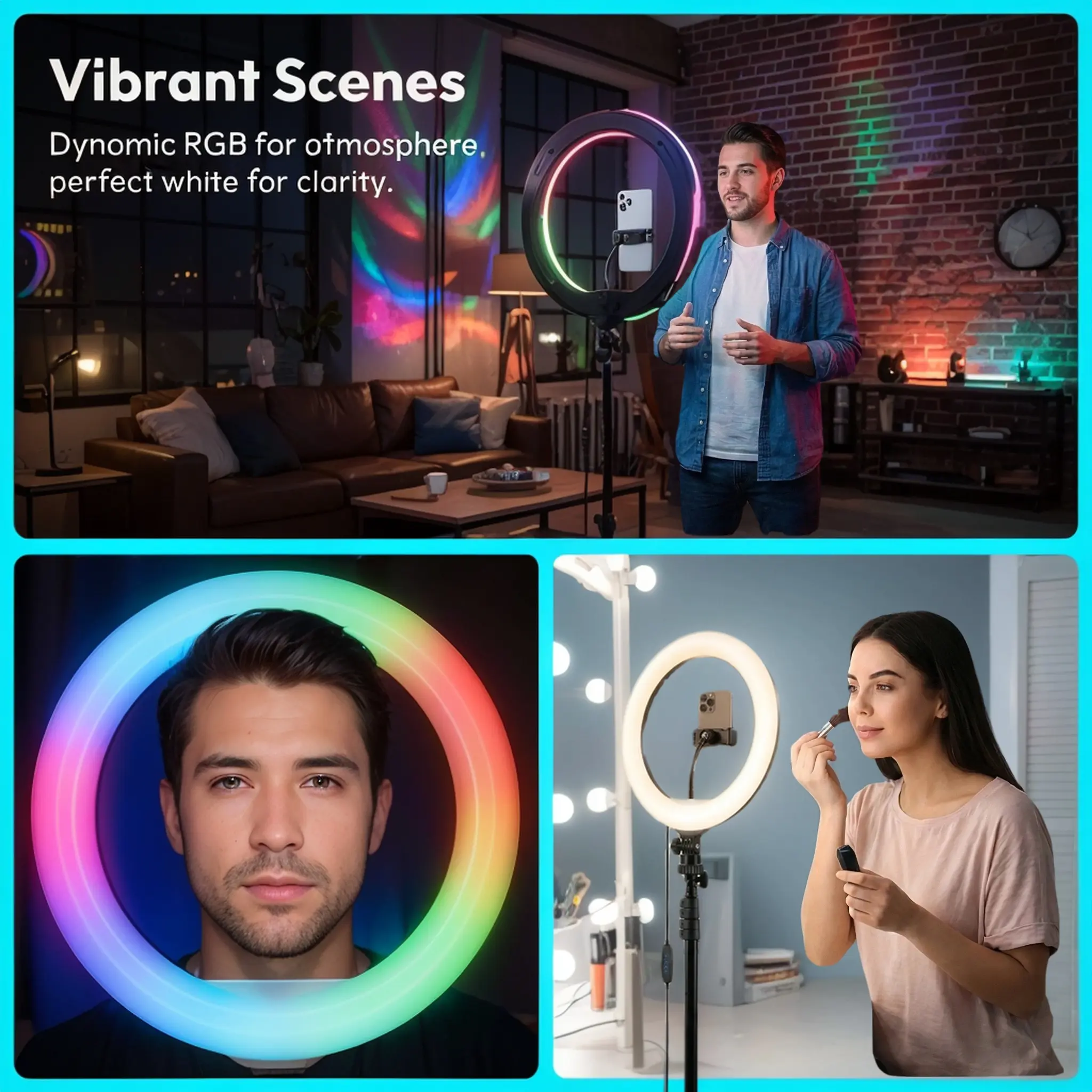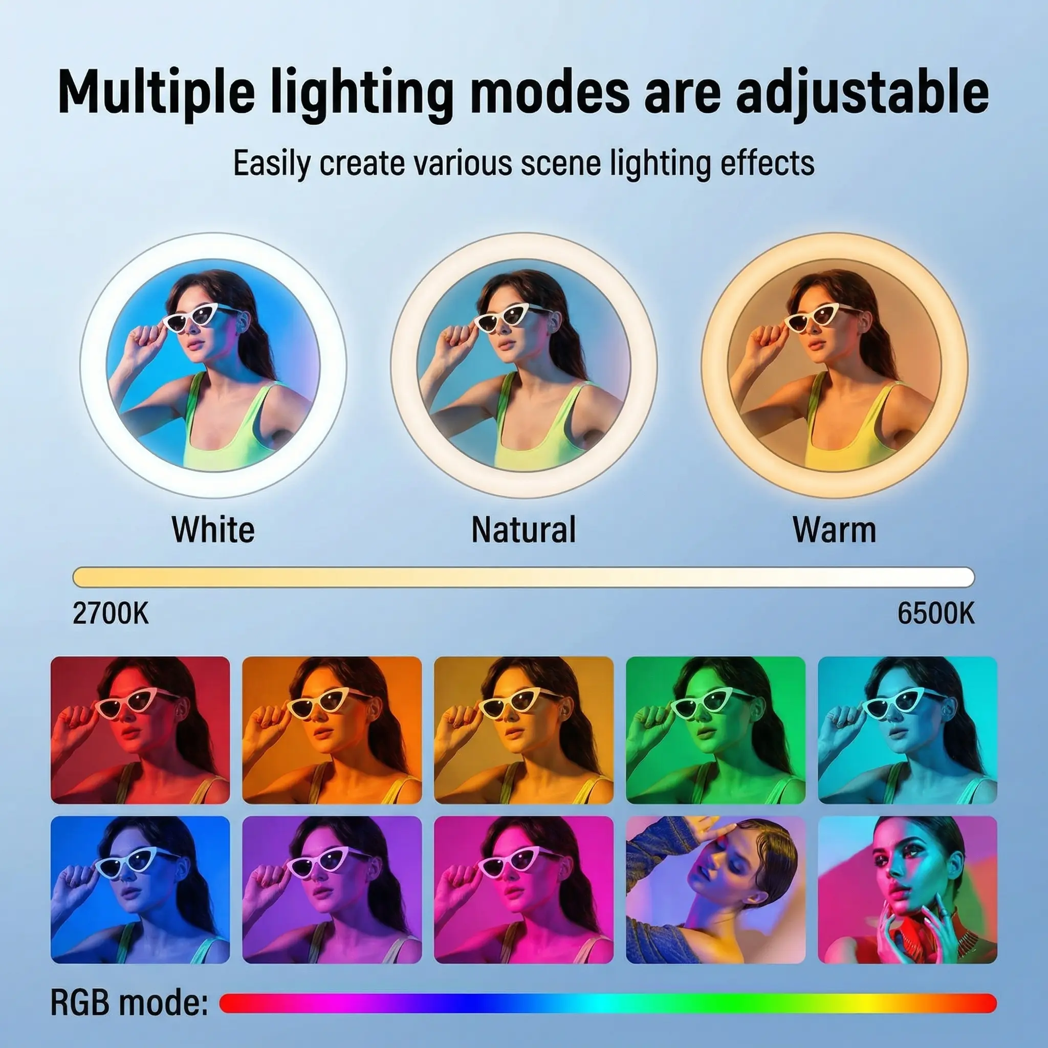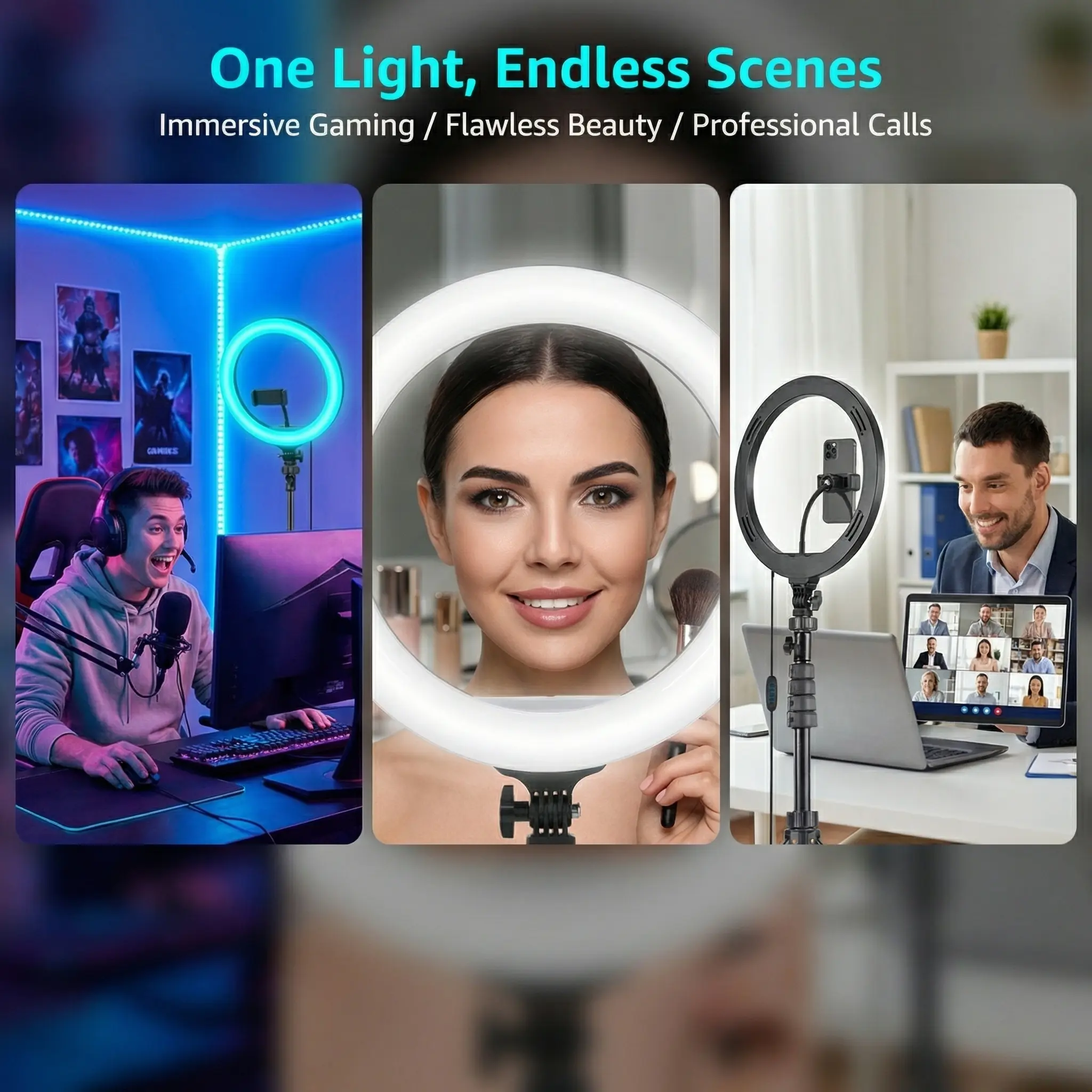 10-Inch Selfie Ring Light Comes with an Adjustable Tripod And Phone Holder, Featuring Dimmable RGB Lighting Ideal for Live Streaming, Vlogging, Photography, And Makeup. It Includes RGB Modes, a Tripod Stand, And a Phone Clamp