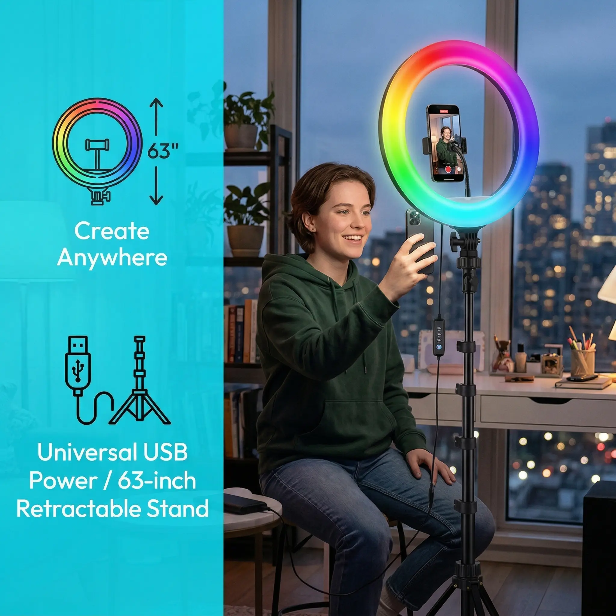 10" LED Selfie Ring Light with 63"Tripod Stand, 38 Color Modes & SteplessDimmable - Circular Light for Vided Recording, Studio Photography, Makeup, LiveStreaming, Smartphone/Tablet Compatible