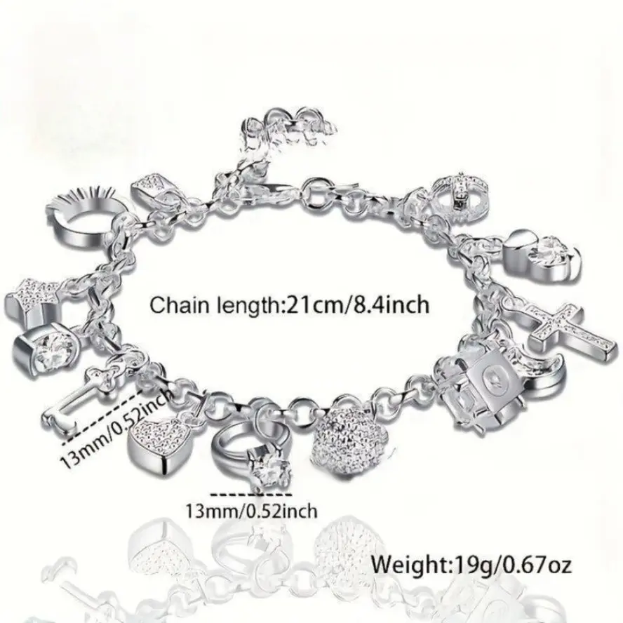925 Sterling Silver Heart Key Charm Bracelet | Handmade Cuban Link | 13 Dainty Charms | Boho-Chic Sparkling Women’s Jewelry (Viral Boho Bracelet)
