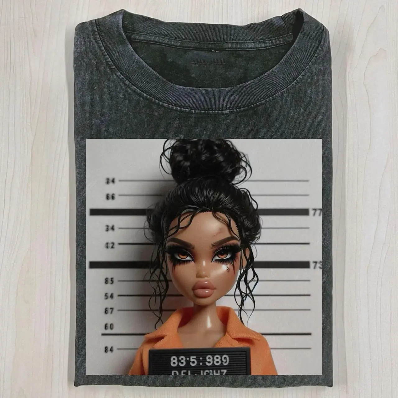Retro Mugshot Doll Graphic T-Shirt, Y2k Style Streetwear, Unisex Cotton Blend, Short Sleeve Crew Neck T-Shirt, Pull On, Casual