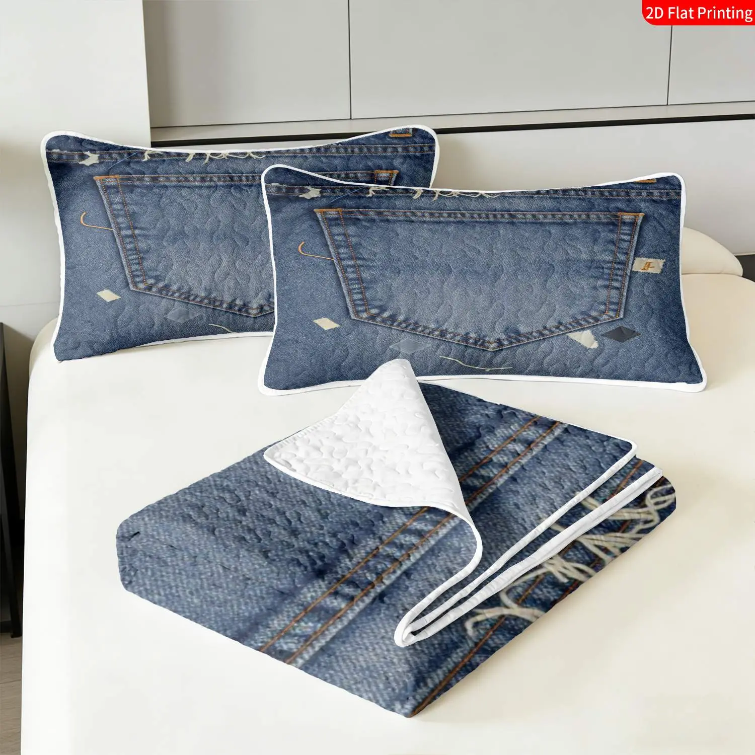 3 pcs, 2D flat print Denim Patchwork bed cover set, Jeans-inspired theme, multiple sizes available, bedding set, festive decorative bedding, ideal for bedroom decor(1 bedspread , 2 pillowcases)