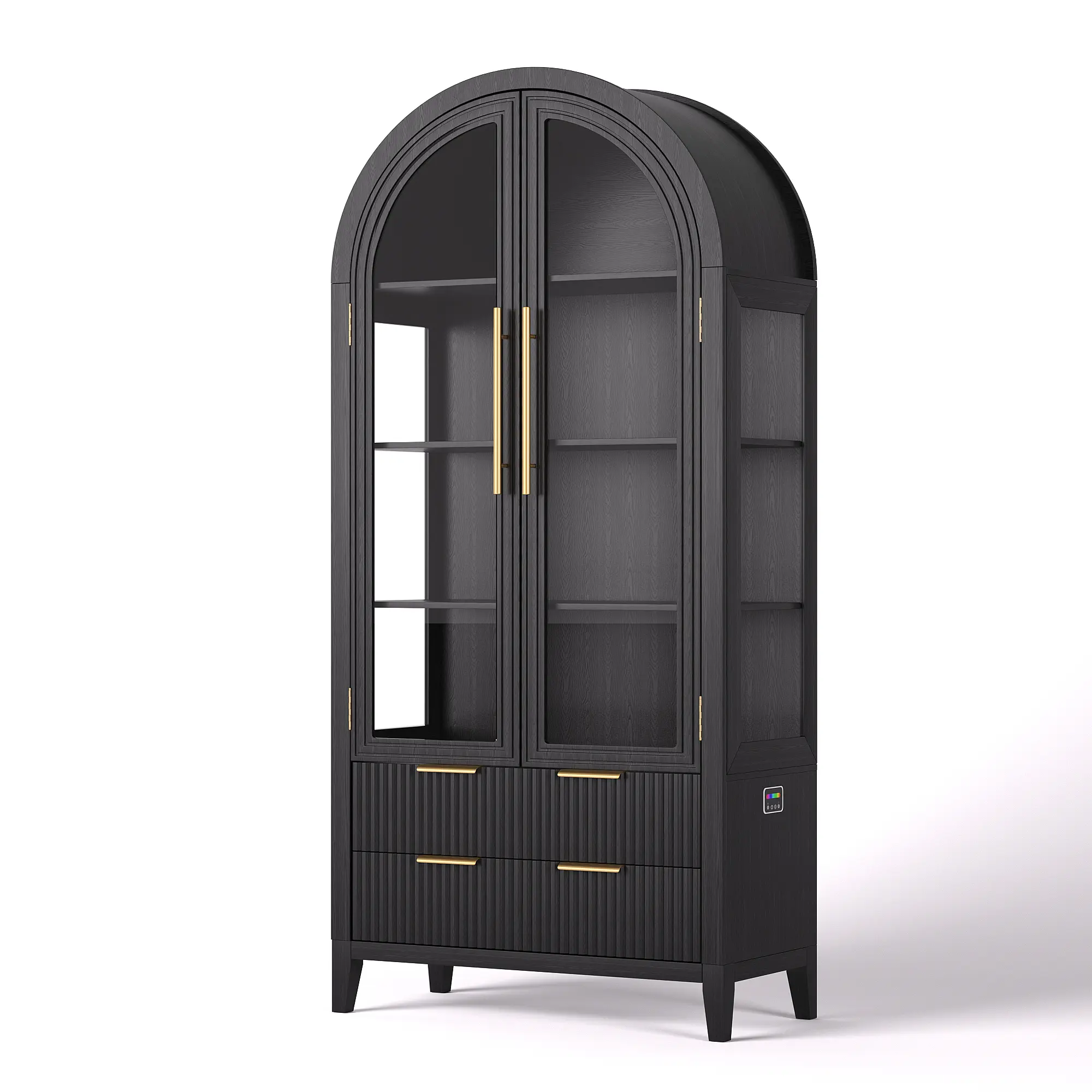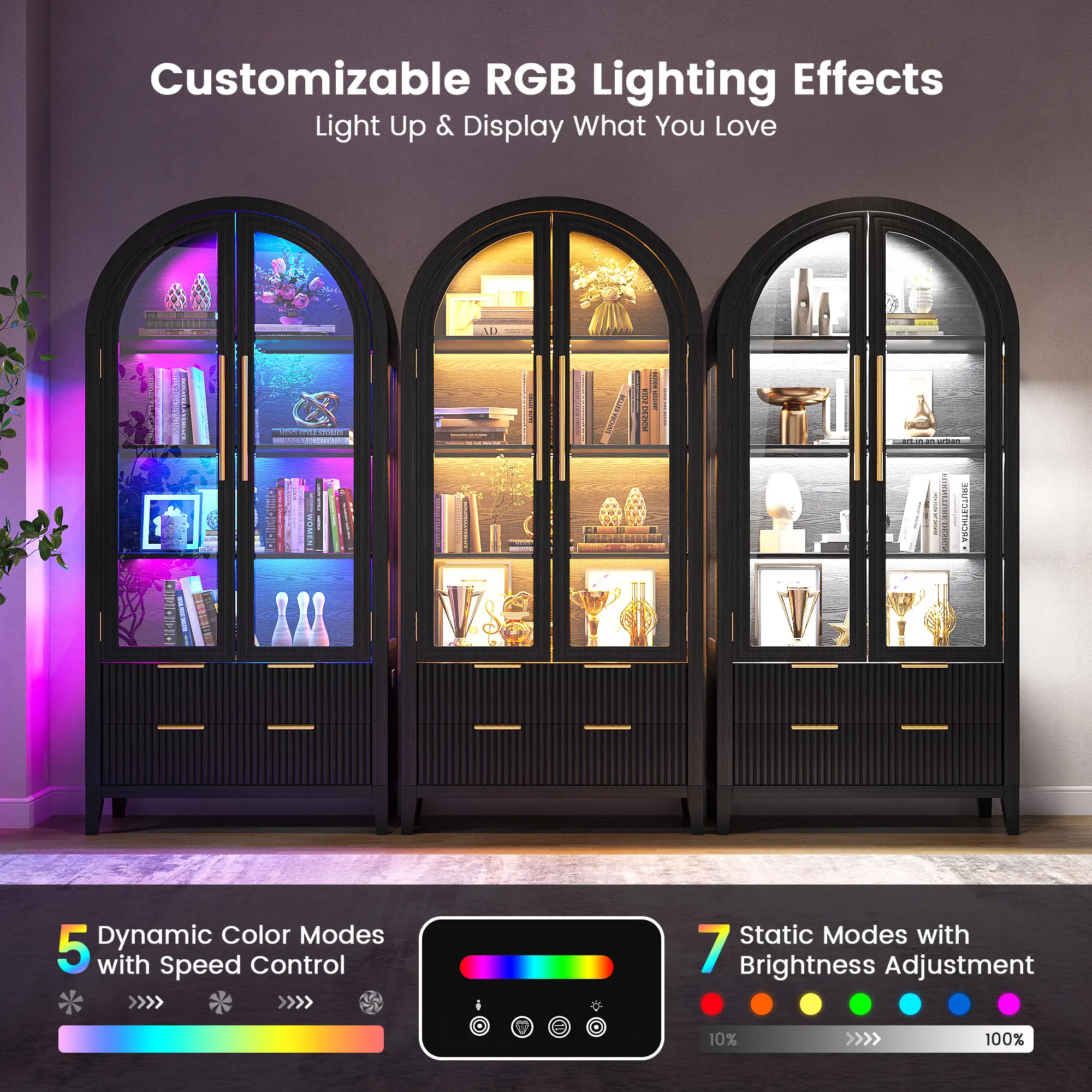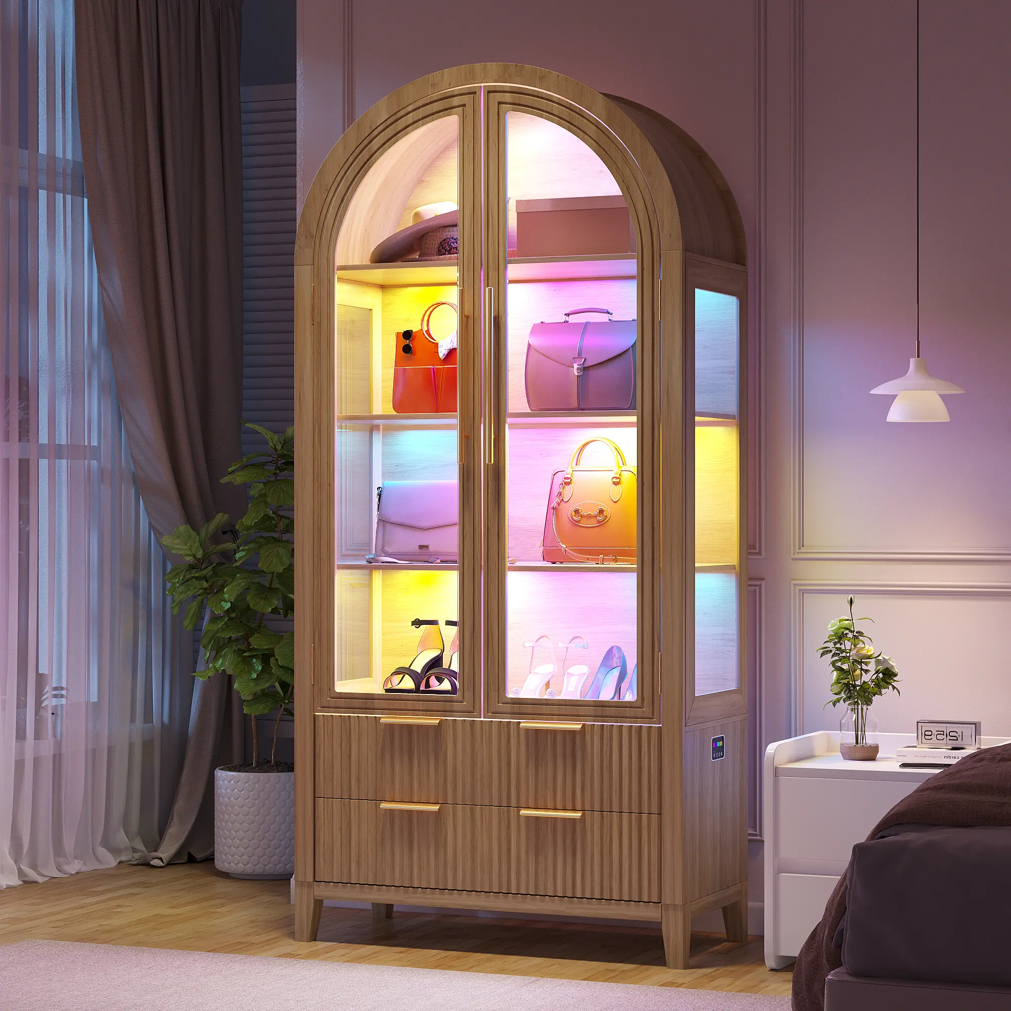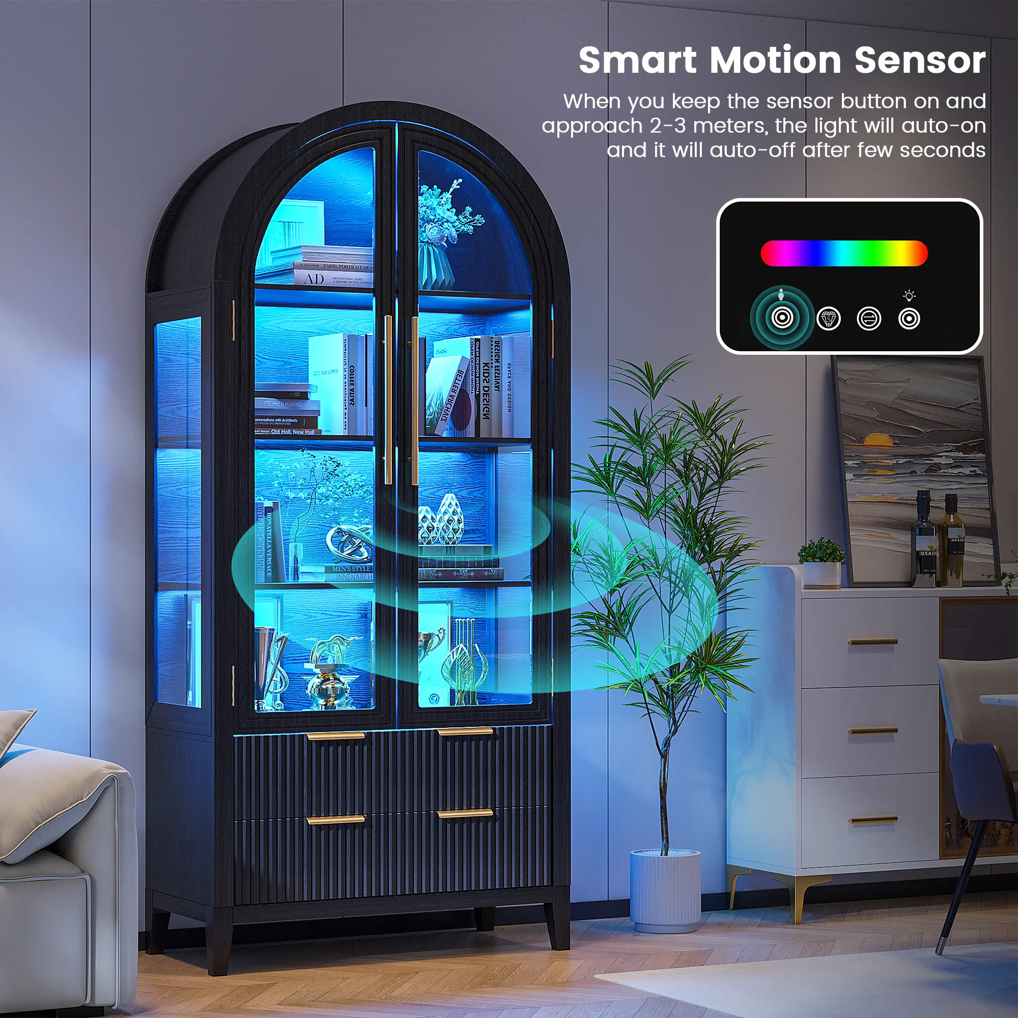 ·Elegant Arch Design & Smart Lighting: This display cabinet features a distinctive arched top adding modern charm. Its natural wood-grain finish complements any décor. Built-in 7 color lights and 5 magical light modes illuminate day or night, enhancing ambiance