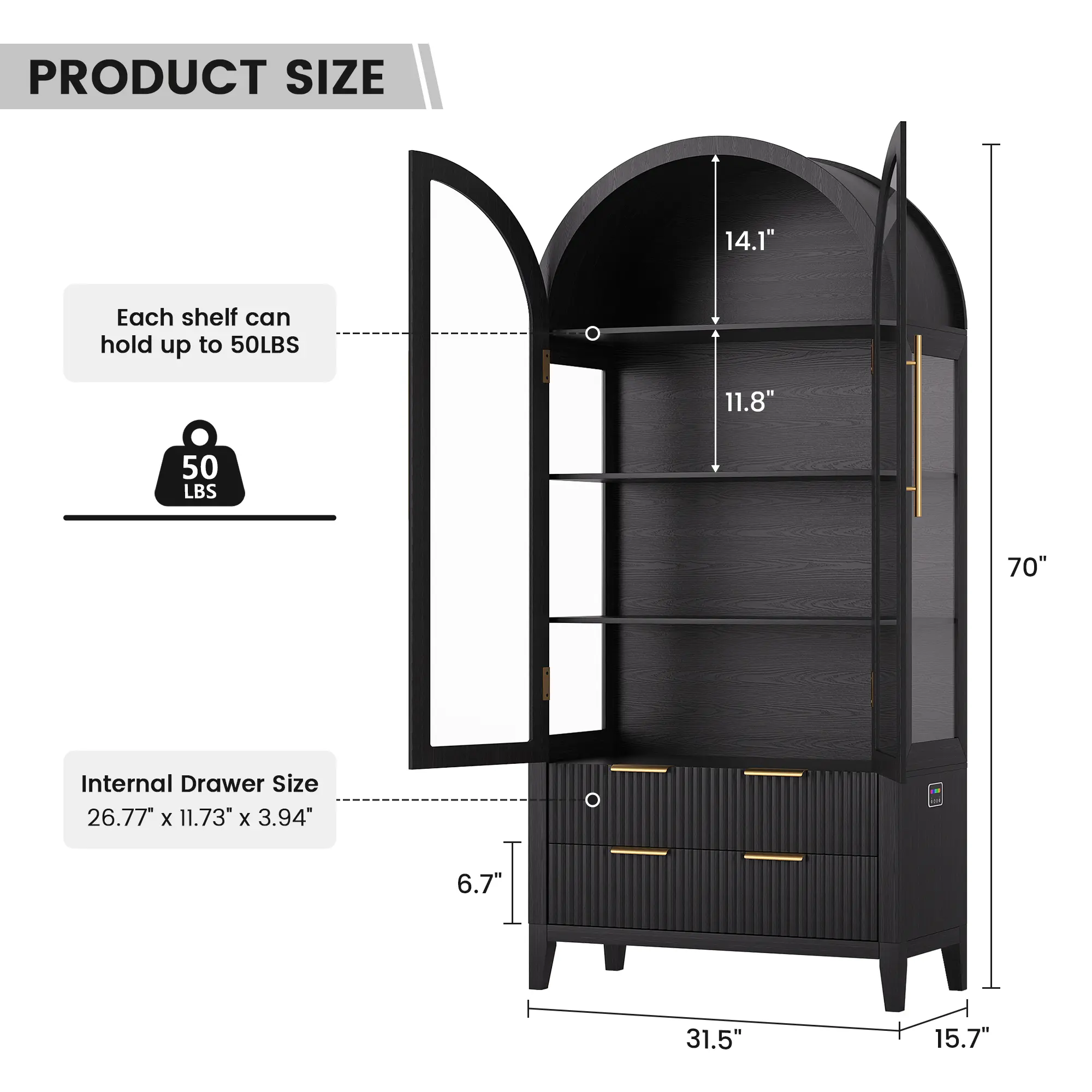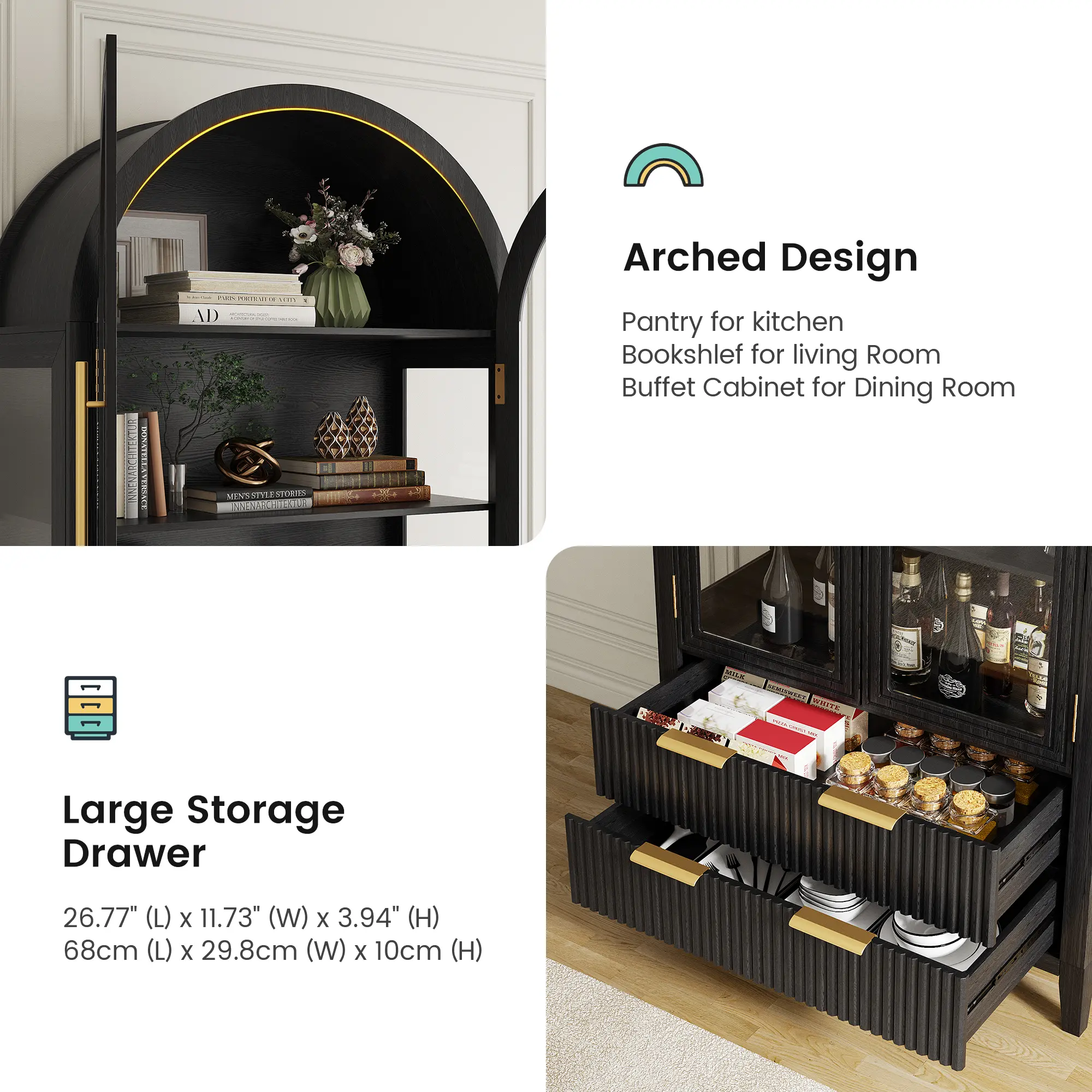 ·Large Capacity and Partition Storage: Featuring 4 thick shelves and 2 spacious drawers. 2 Magnetic glass doors offer easy access to items while blocking dust. Drawers provide hidden storage, categorizing tableware, ornaments, books, etc., use curio cabinet making your home tidy and orderly