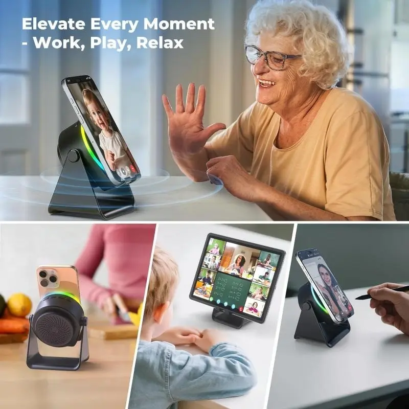 【360° Rotation】: Features a 360-degree rotating stand for flexible audio positioning and enhanced user experience.
