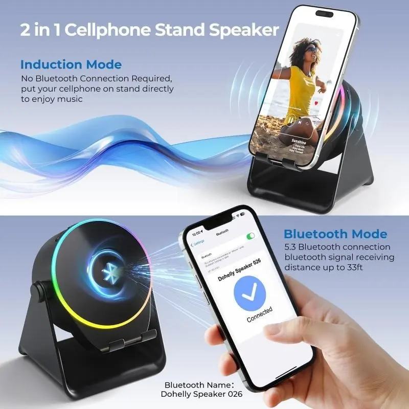 4-In-1 Wireless Bluetooth-compatible Speaker with LED, 360° Rotating Stand, Portable Desktop Holder, Ideal for Home, Shower, Outdoor, Travel Gifts