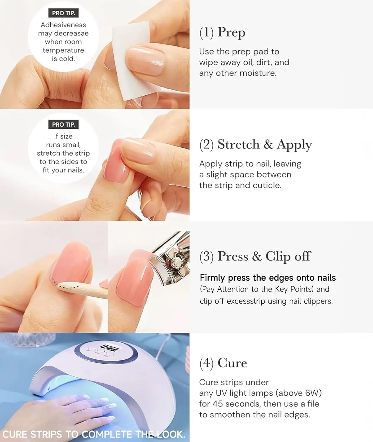 ·Easy to Apply & Remove: Clean the surface of the nail with a prep pad, Choose the right or smaller size, use a stick to press the edge and nail surface, use nail file to build the excess edge, curing 60s. If you want to remove the strip, soak it in hot water or apply nutrient solution