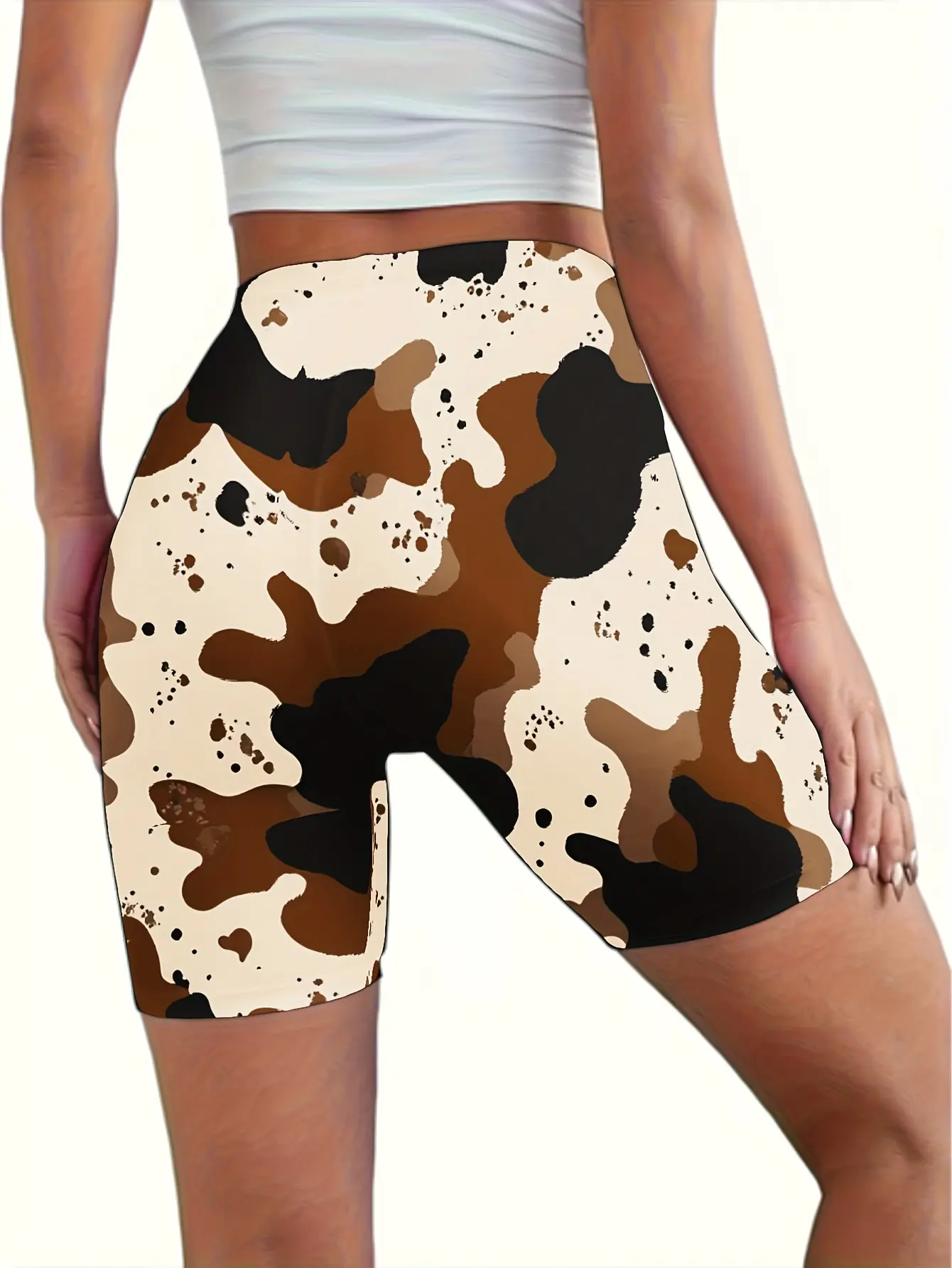 Plus-size women's high-waisted cow-print yoga shorts – featuring an all-over cow-spot design, these stretchy athletic shorts are suitable for the gym, training, sportswear, and everyday wear. They are non-see-through, comfortable, and suitable for al