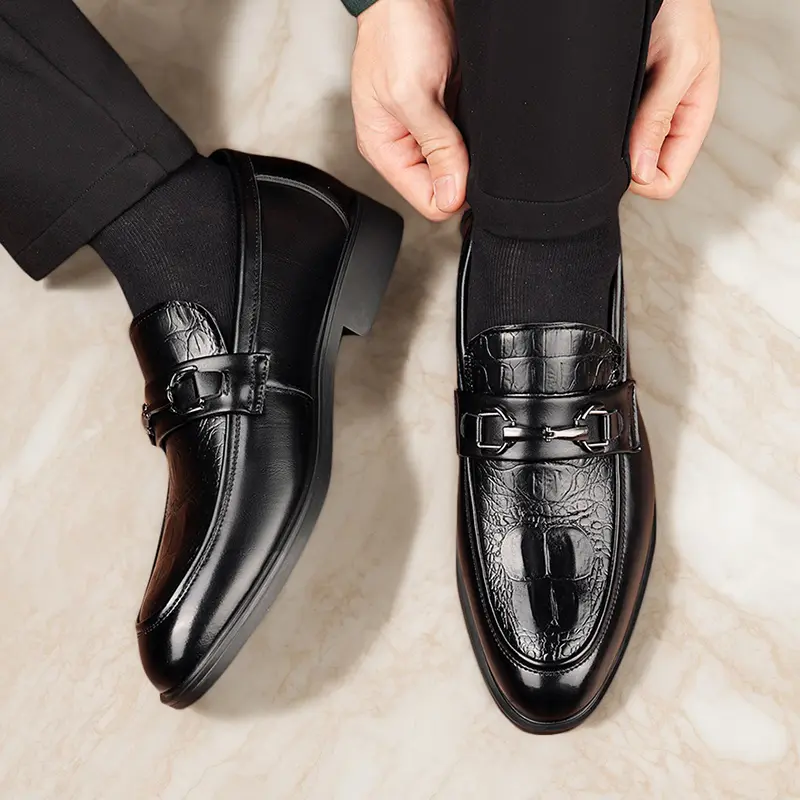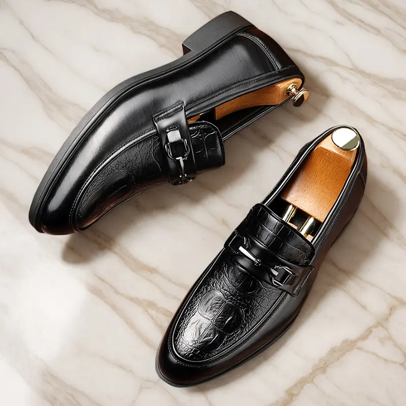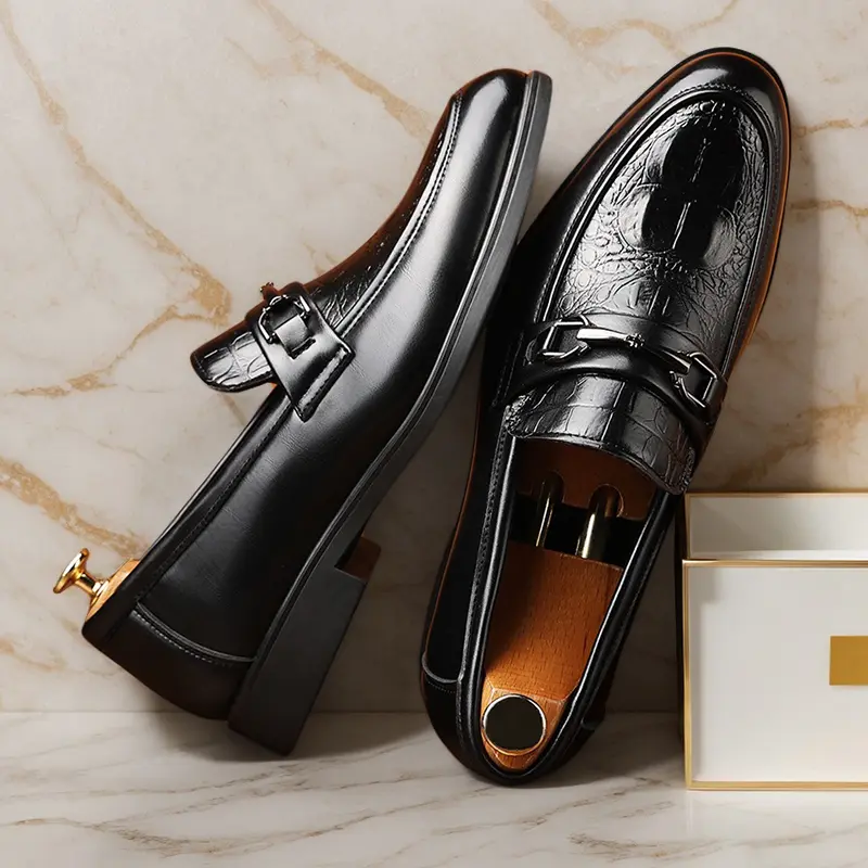 These men's formal loafers are crafted from high-quality black leather with a premium crocodile-embossed texture, featuring a sleek metal buckle strap and a streamlined slip-on silhouette. The polished finish and modern square toe deliver a sophisticated, upscale look, perfect for business meetings, formal events, and daily commutes.