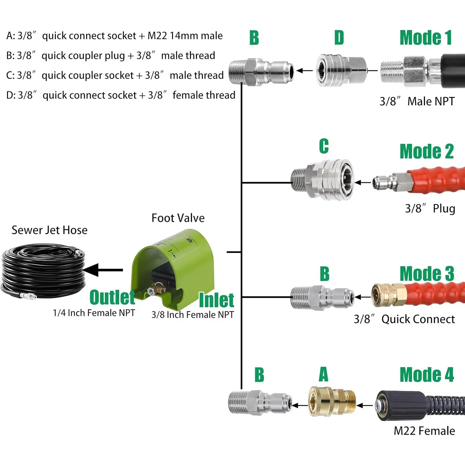 DURABLE & GOOD STABILITY: The sewer jetter foot valve is made of heavy duty steel, which makes it corrosion resistance, stable, and durable.A steel cover is designed on the pressure washer foot valve to protect the pedal and valve ballCONVENIENT DESIGN: A high elastic spring is built under the foot pedal, it keeps the foot valve for the sewer jetter kit a long life.You can easily control the sewer jetting with one foot, and free both hands to feed or retract the sewer jetter hose in the sewer lineWILD APPLICATION: Power washer ball valve comes with 4 adapters: 3/8" quick connect, 3/8" quick connect plug, M22 14 mm male fitting, and M22 14 mm female fitting, which fits most brands of sewer jetter hoses and pressure washer hosesFEATURE: Sewer jetter foot pedal inlet fitting is 3/8 inch female NPT.Outlet fitting of foot valve jetter kit for pressure washer is 1/4 inch female NPT.Max working pressure is 4000 PSI (276 Bar), Max temperature is 140° F (60° C), Max flow rate is 8 GPM(30 l/min)PACKAGE INCLUDED: One-piece pressure washer foot valve, One-piece coupler (3/8" quick connect socket to M22 14 mm male), One-piece coupler (3/8" quick coupler plug to 3/8" male thread), One piece adapter (3/8" quick coupler socket to 3/8" male thread), One piece adapter (3/8" quick connect socket to 3/8" female thread)