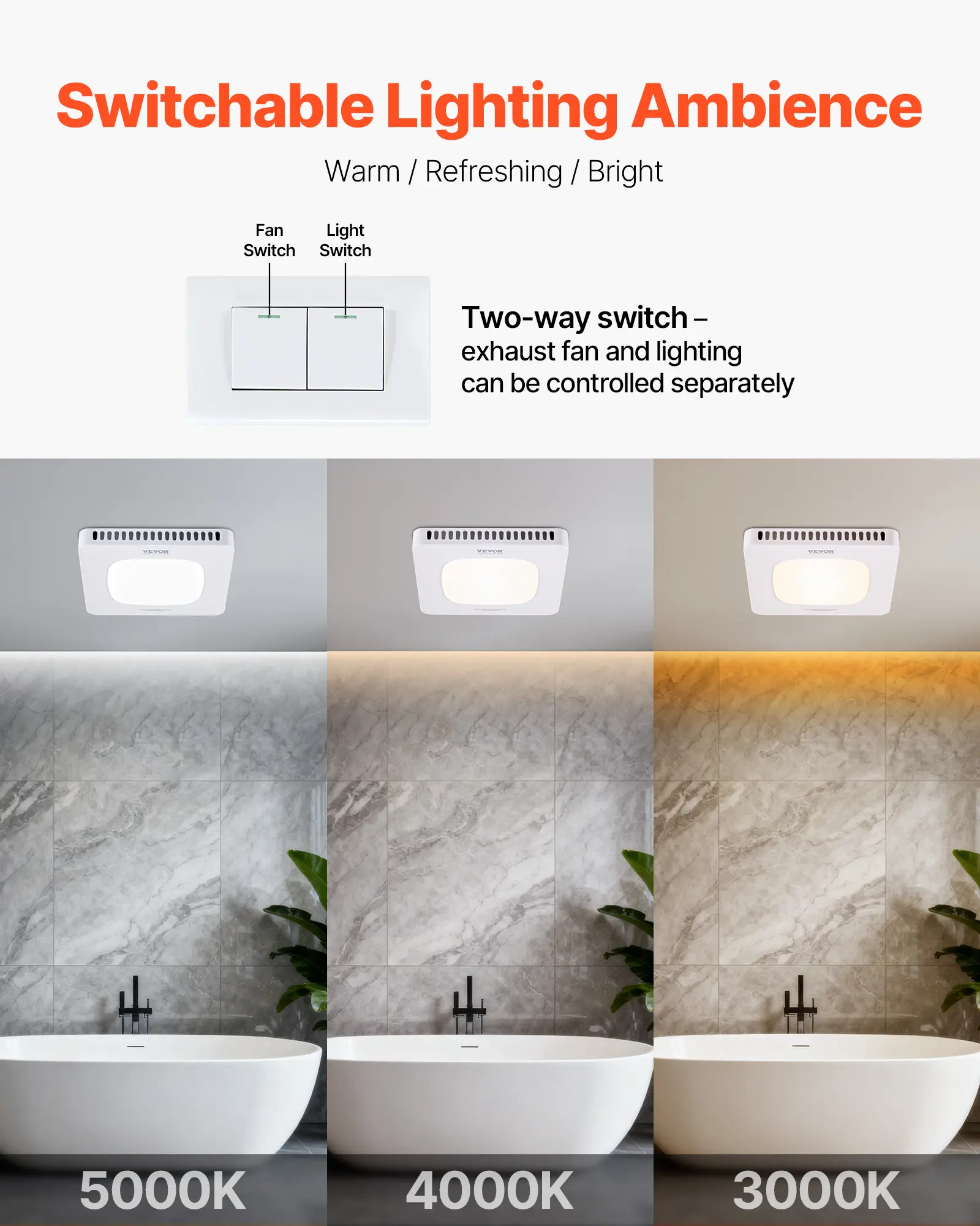 3 Color Adjustable Lighting: Built-in LED offers 3000K warm, 4000K neutral, and 5000K cool light options. Simply toggle the wall switch to match grooming, cleaning, or relaxing needs