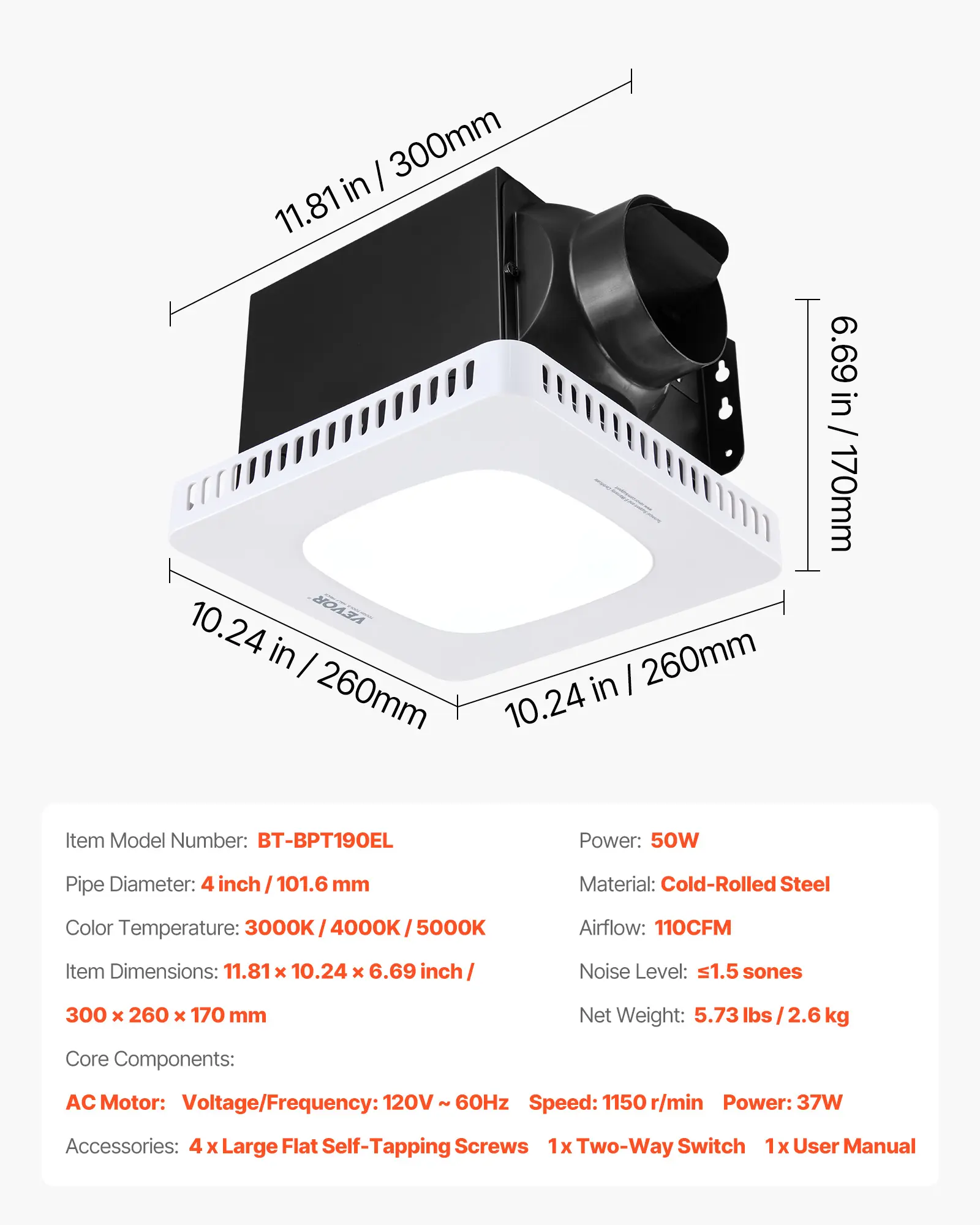 User-friendly Installation: Sized 11.81 x 10.24 x 6.69 in / 300 x 260 x 170 mm, fits ceilings sized 7.68 x 7.60 in / 195.1 x 193.0 mm, with a standard 4-inch duct connection, this bathroom ceiling fan includes quick connectors and screw for easy DIY setup