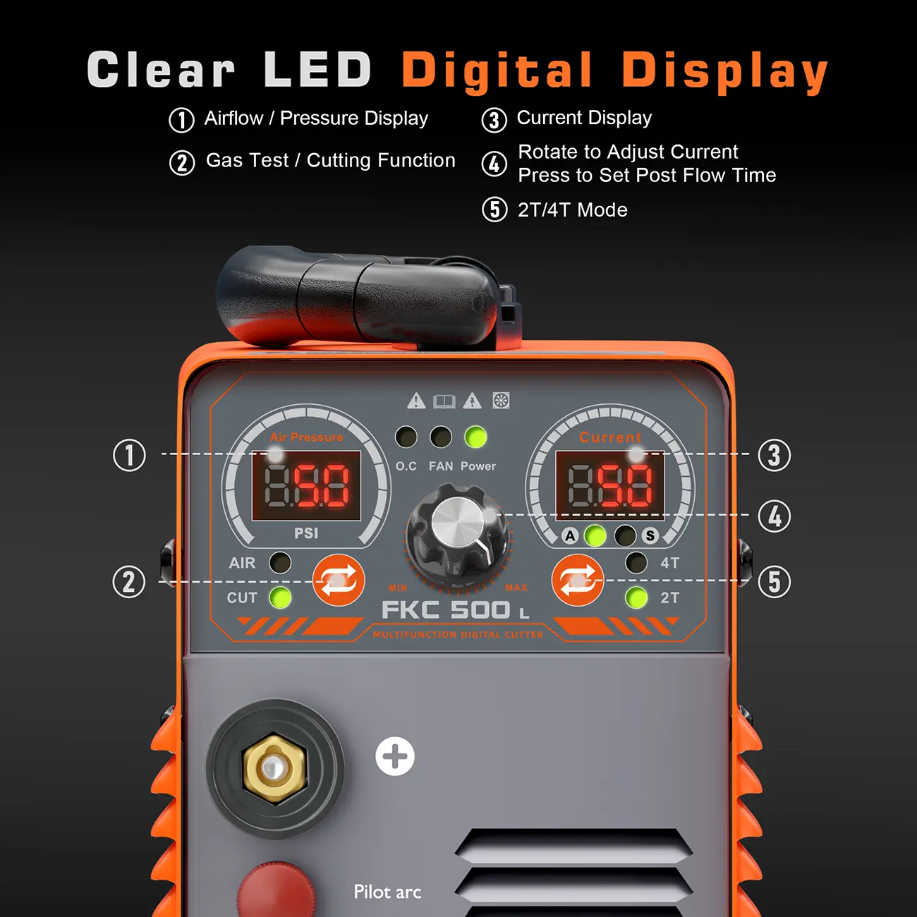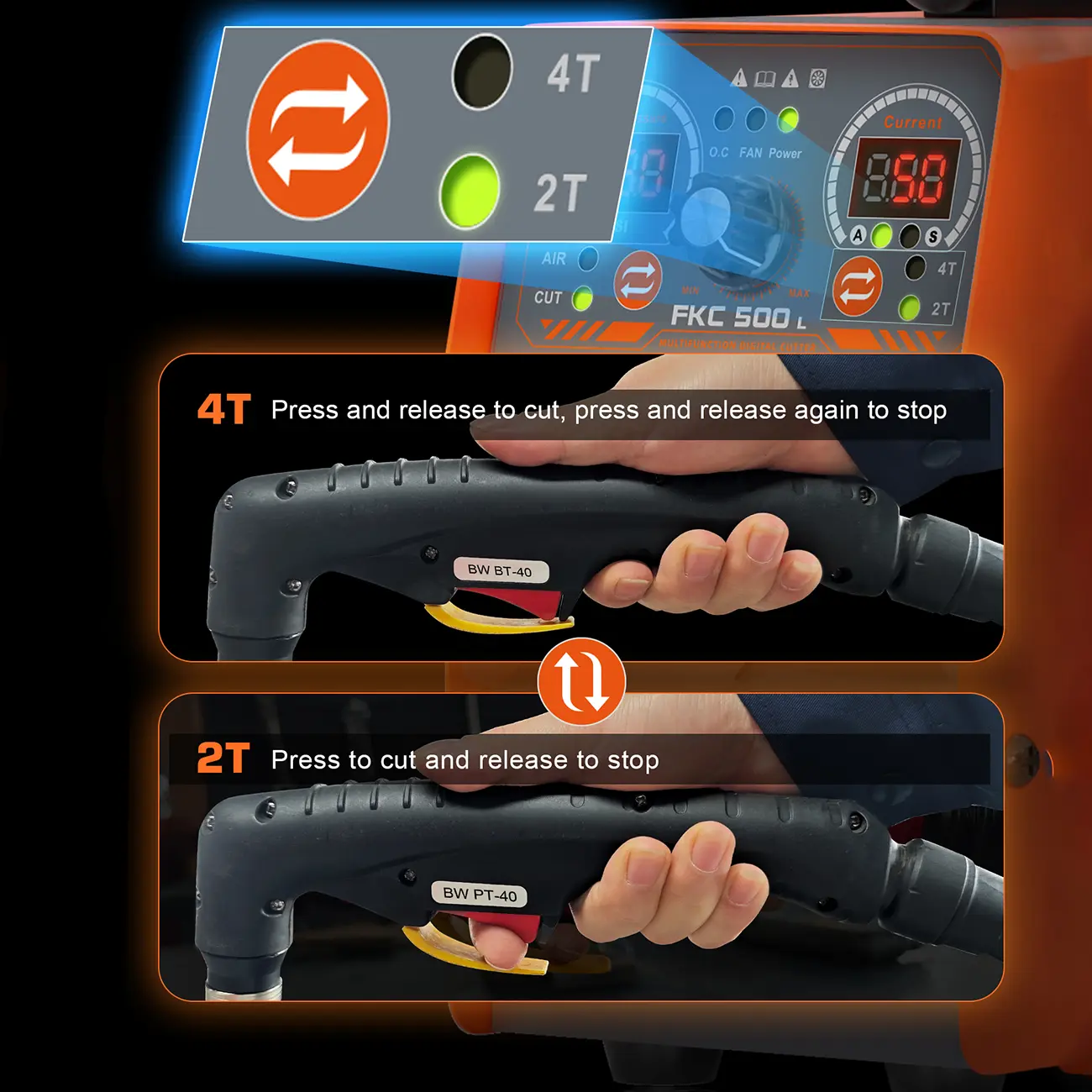 【2T/4T/Post-Flow Function】2T mode is suitable for flexible cutting, ideal for short, precise cuts and welding works that require frequent start and stop actions. 4T mode is designed for extended cutting operations, reducing operator fatigue, perfect for long or continuous cutting work. The adjustable post-flow time (ranging from 2-15 seconds) helps cool down the torch head after cutting, ensuring a cleaner cut surface and extending the torch’s lifespan
