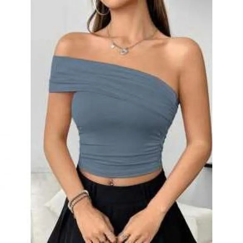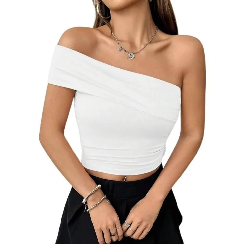 Sexy Y2K Ruched Crop Tee Shirt for Women, Solid Color Oblique Off Shoulder Short Sleeve Top, 2026 Summer Fashion Essential, Perfect for Club Party, Travel & Daily Casual Outfit