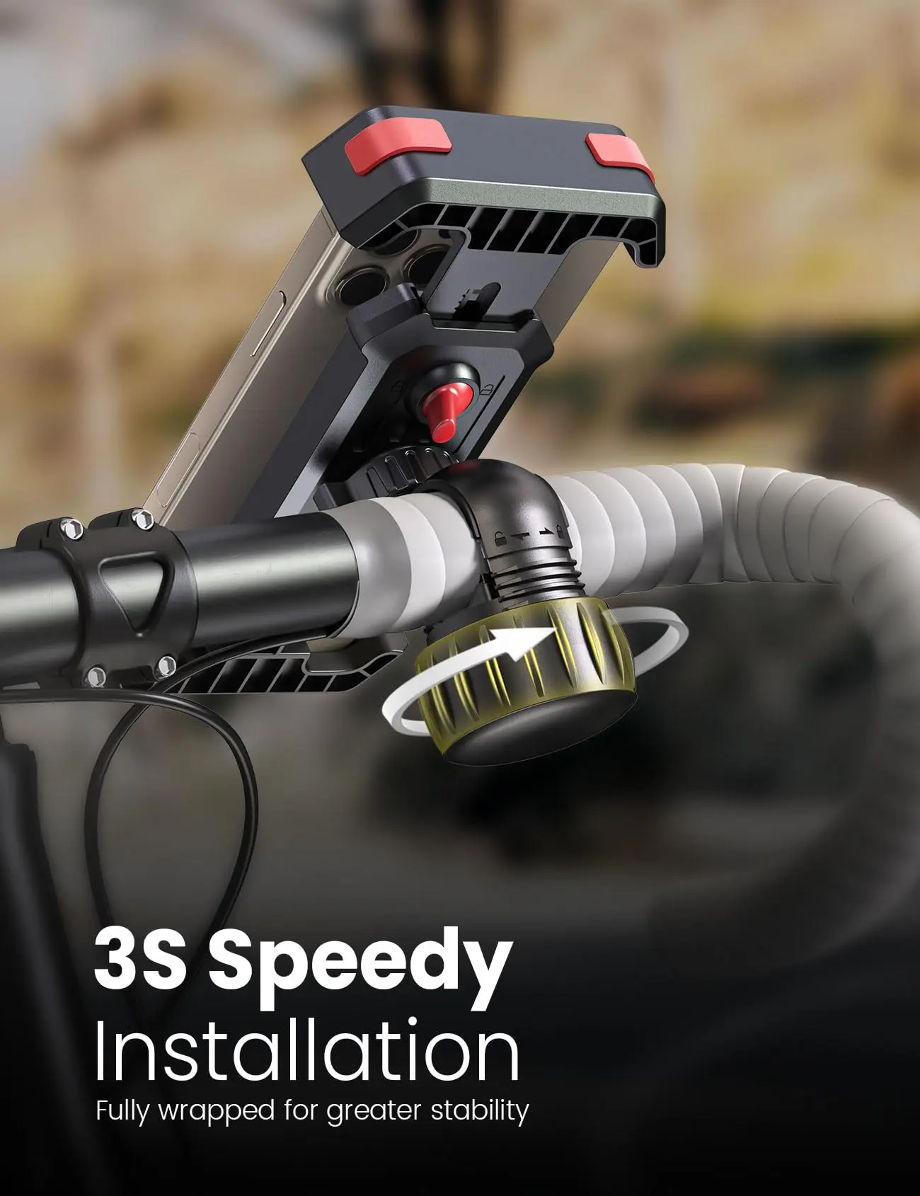 ·3S Effortless Installation: 2025 Full Upgraded High-Quality Bike/Motorcycle Phone Mounts. Secure your bike phone holder handlebar with a simple twist, as easy as tightening a bottle cap. Our innovative bike phone mount handlebar clamp installation mechanism is meticulously designed for maximum user convenience. Say goodbye to complex mounts.