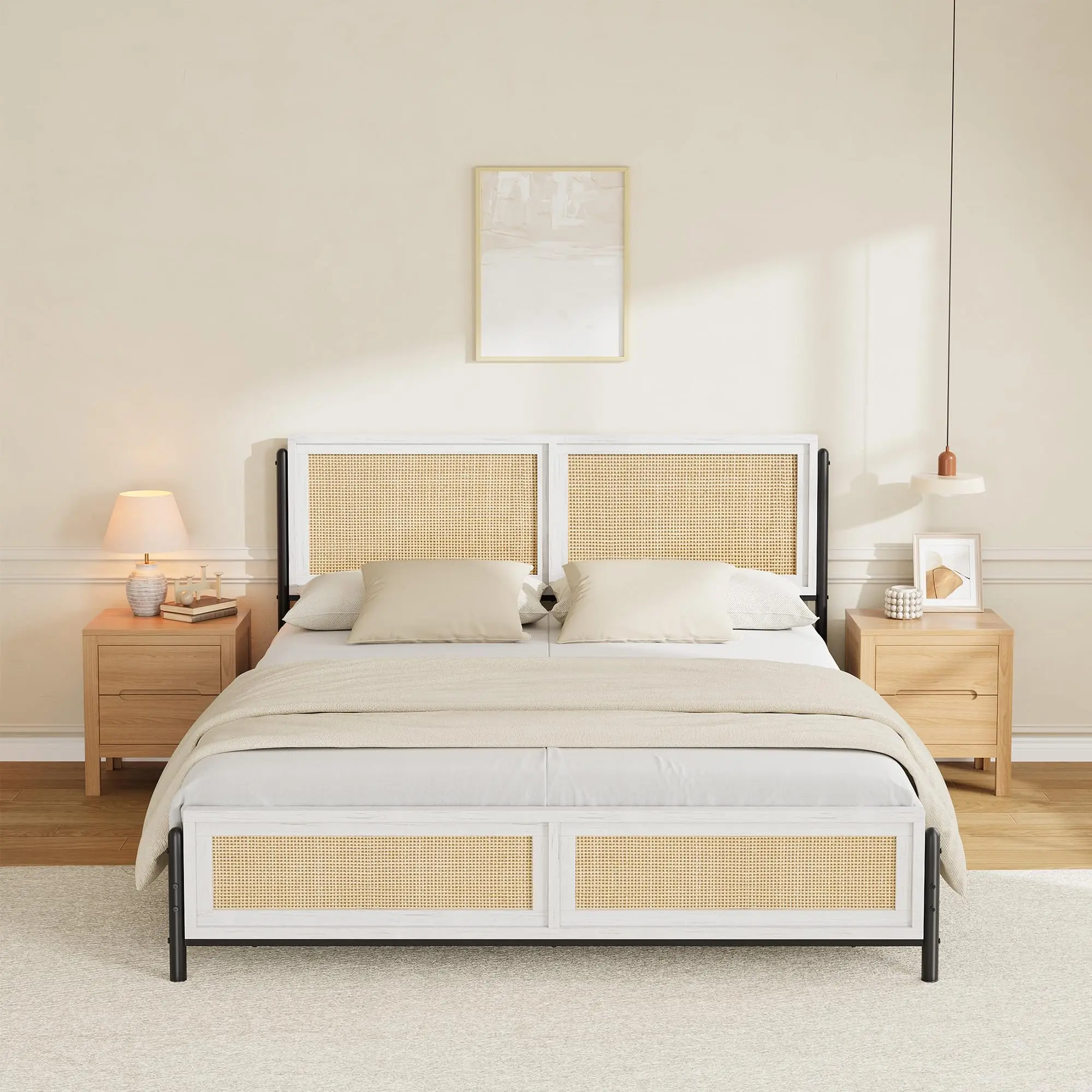 · RATTAN HEADBOARD & FOOTBOARD- Natural rattan woven over a wood‐grain frame delivers a boho-chic look and a cool, tactile feel. The clean lines and warm tones blend seamlessly with any décor, creating a relaxed, harmonious bedroom vibe.