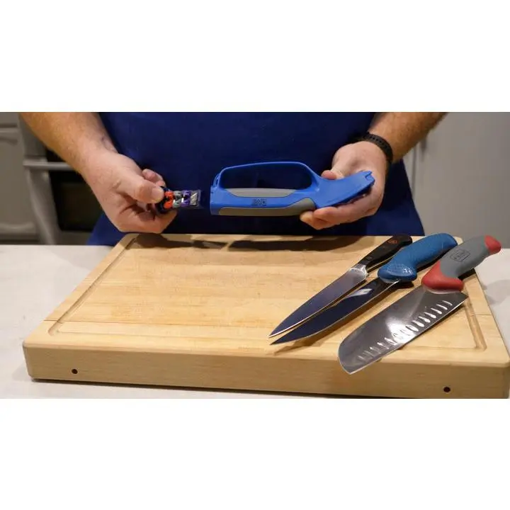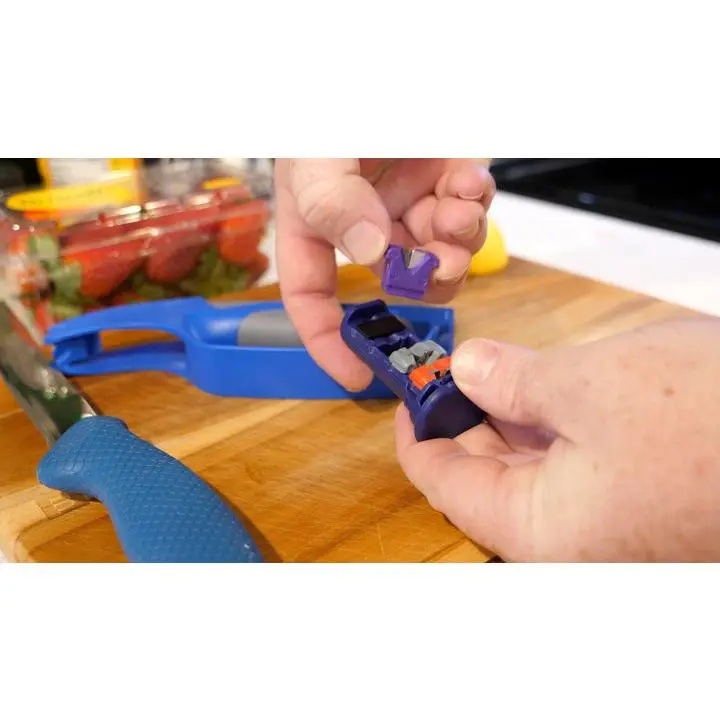 Three sharpeners in one. This cartridge-based sharpener allows you to sharpen straight blade kitchen knives, serrated knives and shears. Includes 3 color-coded, interchangeable cartridges that can be conveniently stored inside the handle. Ergonomic, hand-held sharpening.