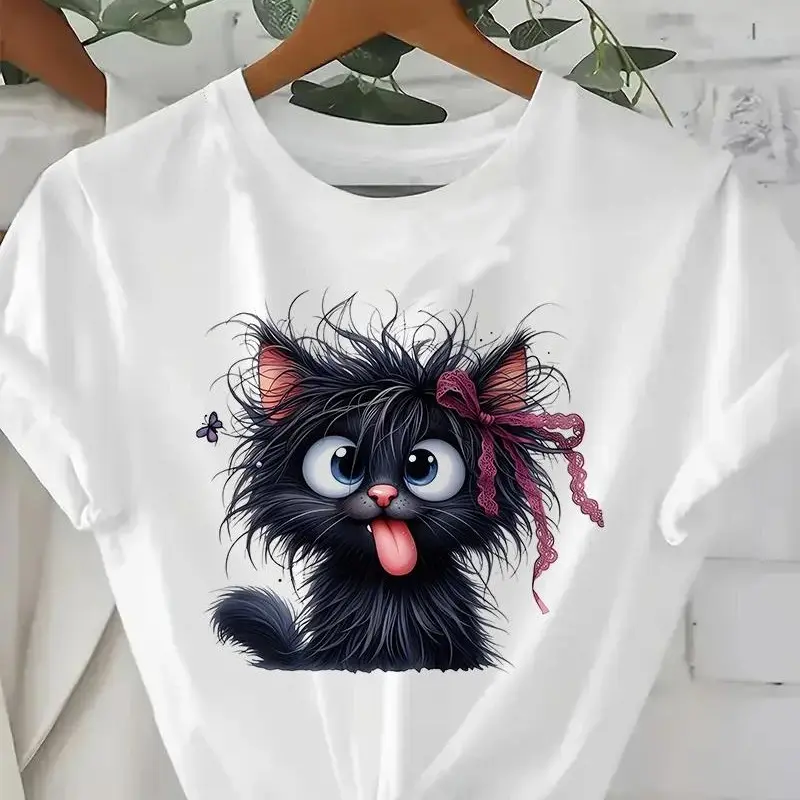 Women's Funny Fried Cat Cartoon T-Shirt with Playful Bow Butterfly Print Women's Casual Short Sleeve T Shirt Clothing Top Tee