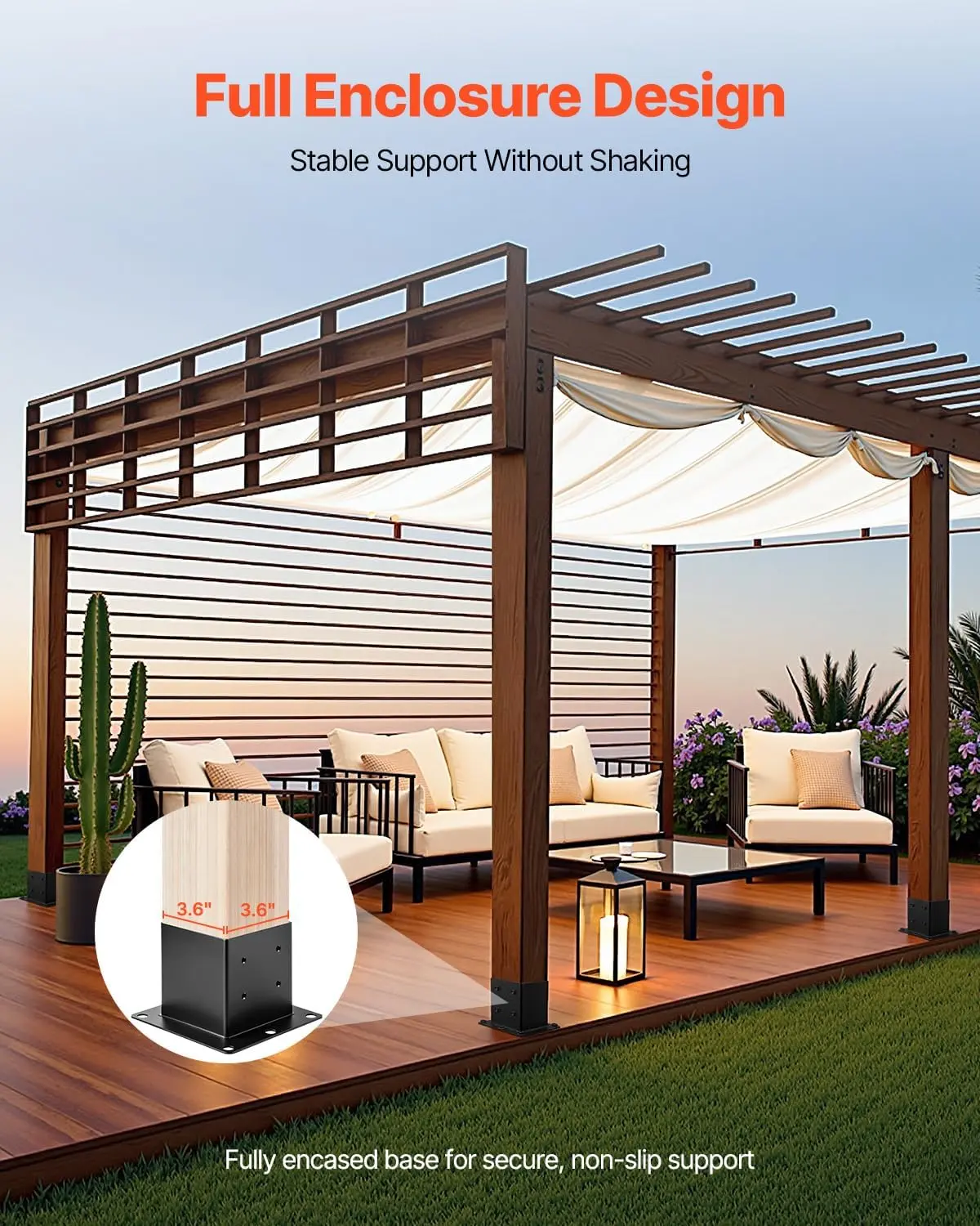 ·Stable Support: Each post base measures 3.78 x 3.78 inch, with a total of 4 pieces. The inner tube size is 3.6 x 3.6 inch, and the bottom cross-section size is 5.5 x 5.5 inch. It is recommended for use with 3.5 x 3.5 inch posts. The fully enclosed design provides secure, effective support and ensures no wobbling during use