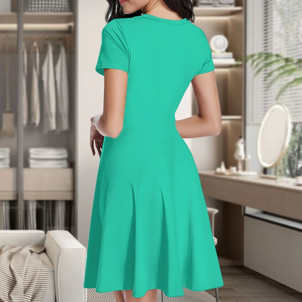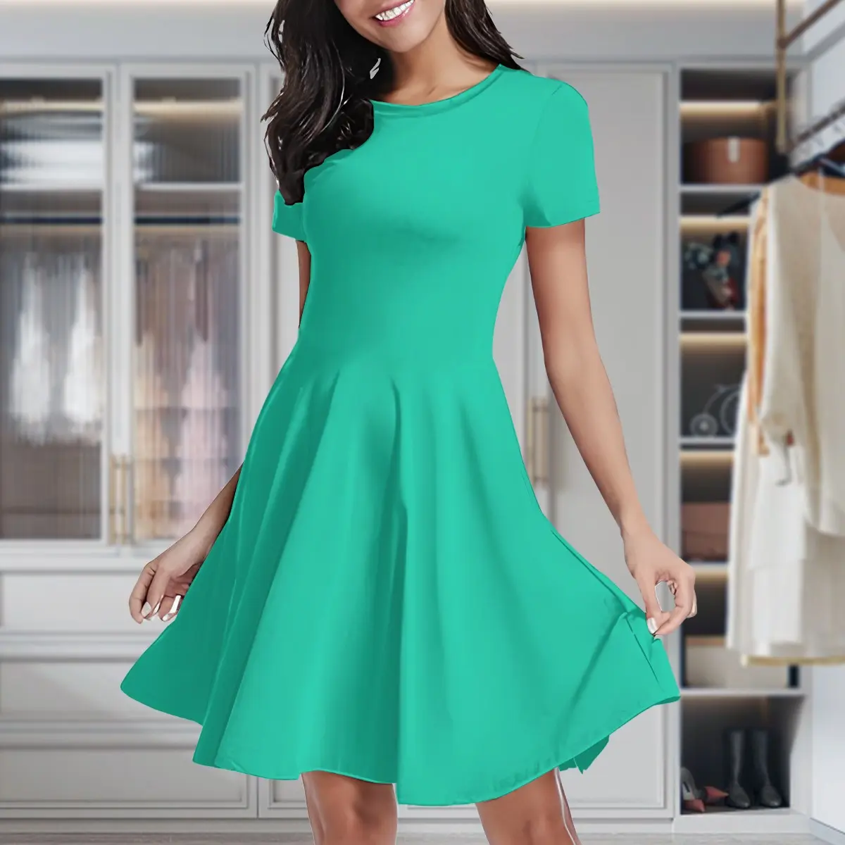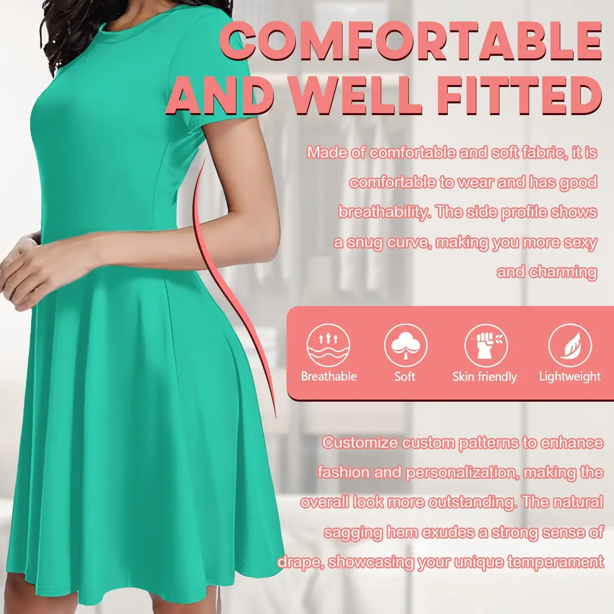 This women's summer dress features a short-sleeve and round neck design, with a length above the knee. The flowy and loose fit flatters your figure perfectly, effortlessly hiding your abdomen while keeping you comfortable and stylish. No matter where you go, you’ll stand out as a fashion focal point. It allows you to customize your look for any occasion—from casual days out to chic date nights, this dress has got you covered.