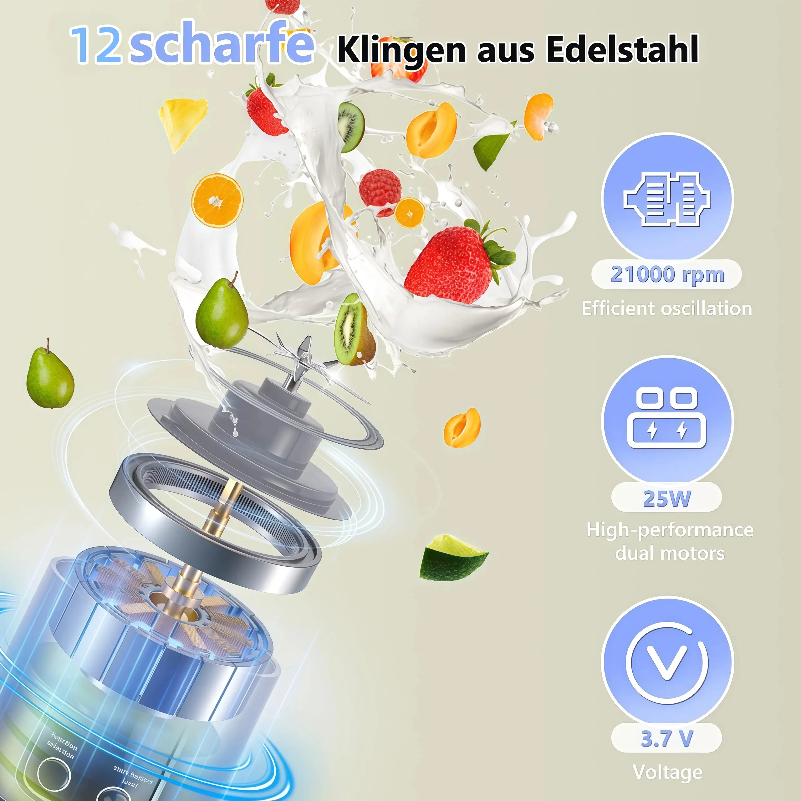 ·Safety & Food-Grade 12 Blades :Our Portable juicer made of high-quality food-grade, non-toxic ABS and 304 stainless steelFeatures an elegant hand-held M-cup lid design that not only looks beautiful but also allows for easy disassembly of the cup and machine. Features a robust 50W motor and 12 stainless steel blades spinning at 12,000 RPM. It can easily crush ice cubes and frozen fruits