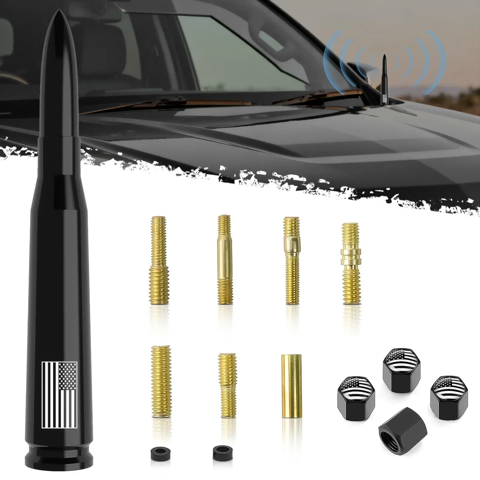 Enhance your vehicle's functionality with the American Flag 50 Cal Bullet Antenna, designed specifically for the Ford F150, F250, F350, Super Duty, Ford Raptor, and Bronco Truck models. This essential accessory is compatible with GM Chevy Silverado 1500, 2500, and 3500 models, ensuring a perfect fit for your vehicle.The Size:0.8 x 0.8 x 5.5 inches