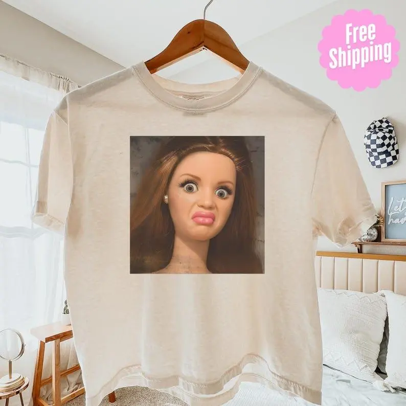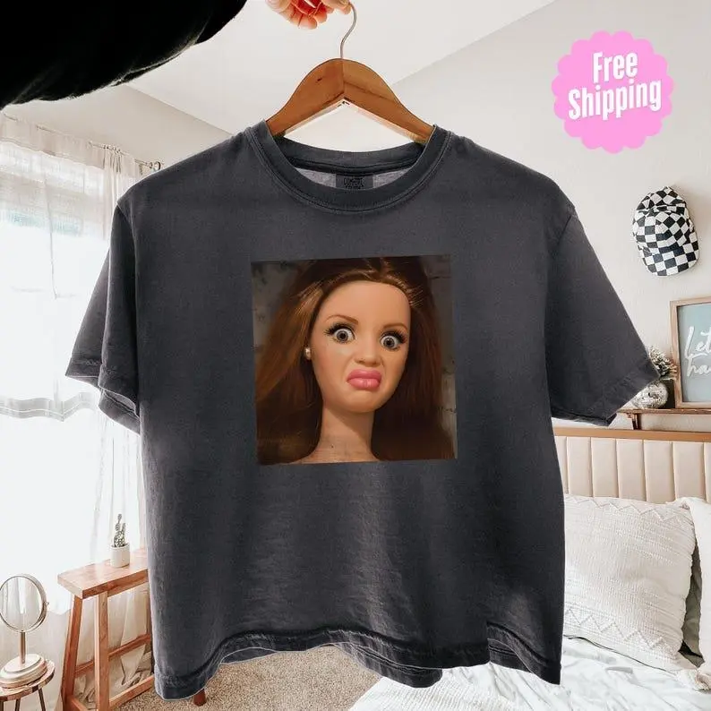 Funny Doll Face Crop Tee Sarcastic Humor Graphic Shirt Vintage Pigment Dyed Cotton Top