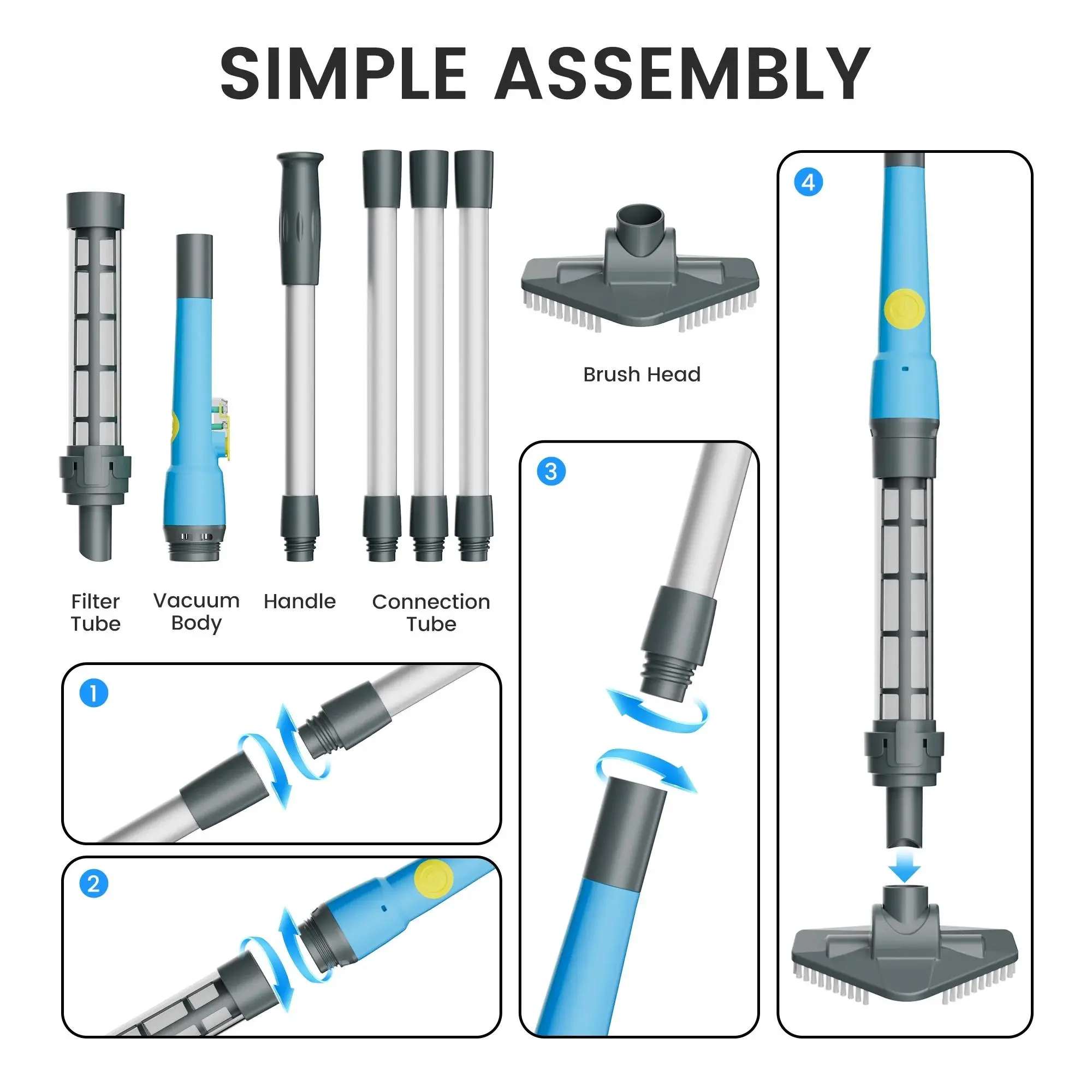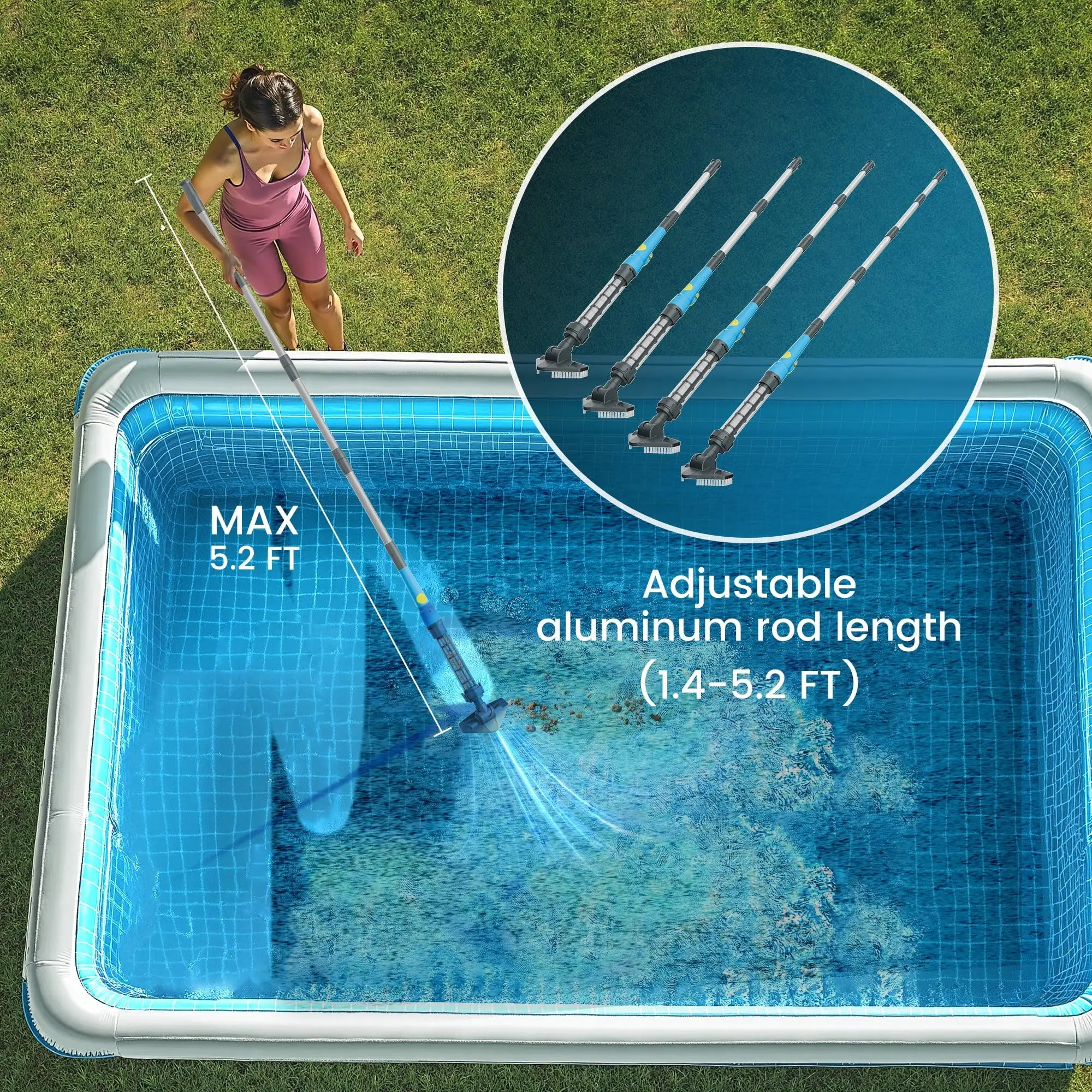 ·Weighing just 2.4 lbs, this handheld vacuum pairs effortless maneuverability with a collapsible 4-section aluminum pole (extends to 2.2m), making storage simple for above-ground pools and small spaces.
