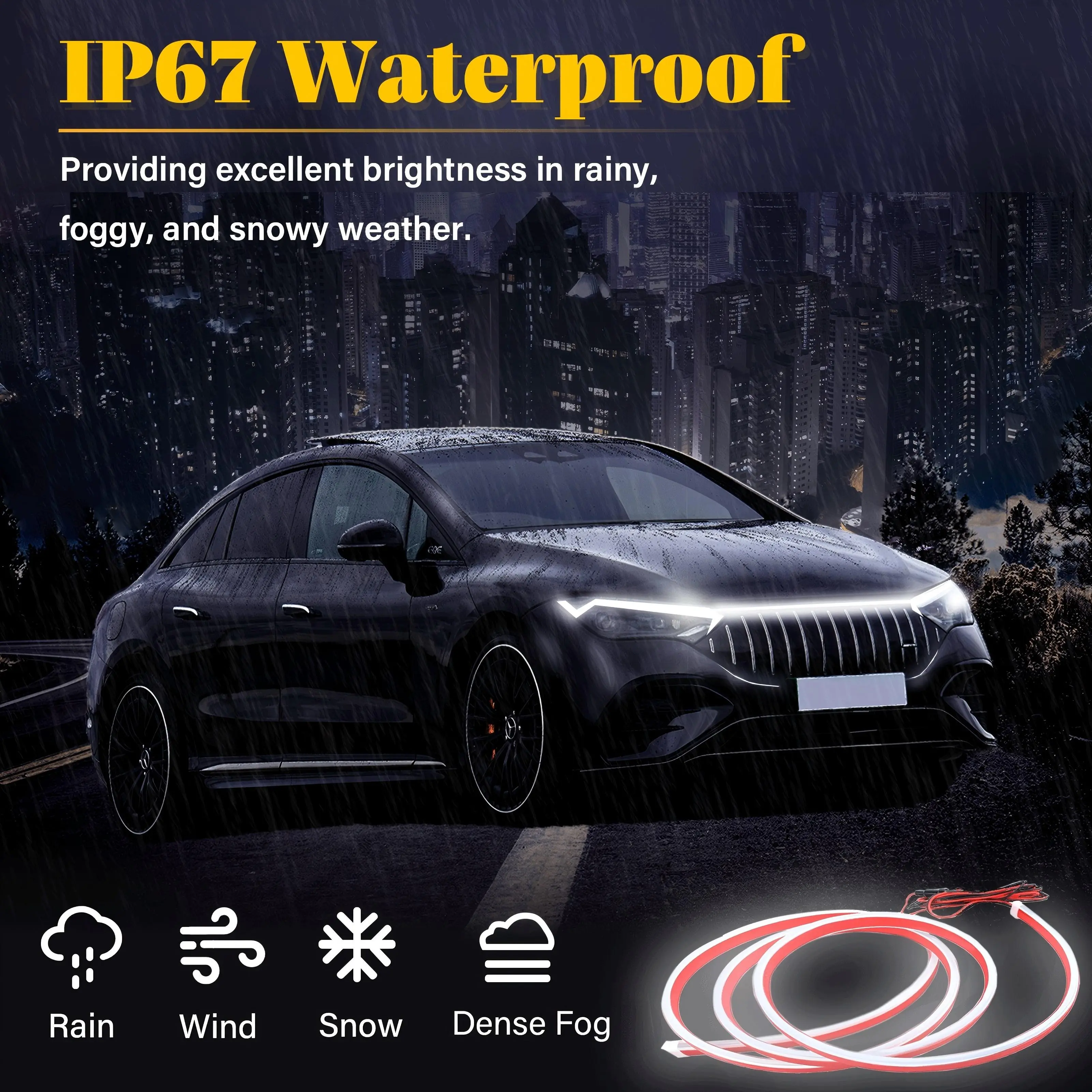 This DIBMS 71" LED strip offers dynamic scanning activation, making your car cooler. The LED beads, 2835 high-quality lamps, provide super brightness. Perfect for nighttime driving, it increases illumination and ensures safety. The strip is easy to install with super glue on the back, attaching effortlessly to the hood gap. The red wire connects to ACC, and the black wire to the negative pole.