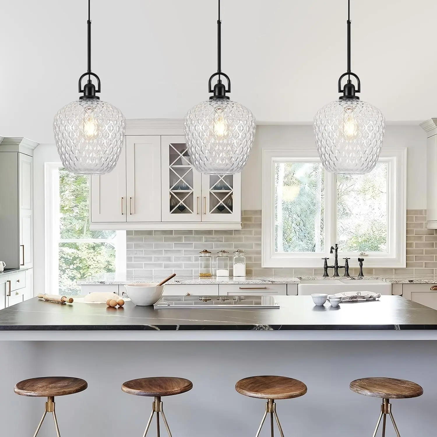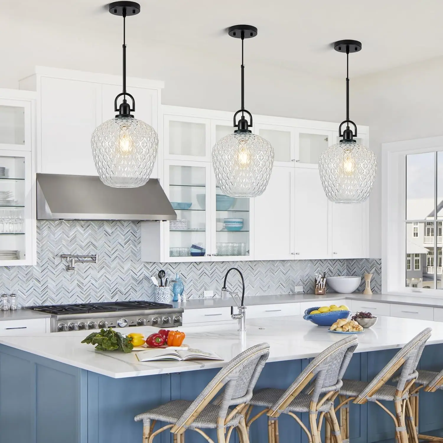 Large Glass Pendant Lights Kitchen Island, 10" 1-Light Black Fixtures with Hammered Glass Modern Hanging Light for Kitchen Island Dining Room Entryway Foyer