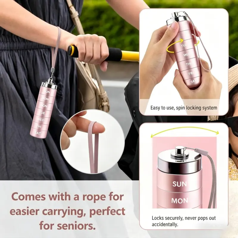 As a stackable pill holder, customize the number of days. Compact and cute, it fits in pockets, handbags, or backpacks. Rotary locking method keeps pills secure. Lightweight and compact, with extra-large compartments.