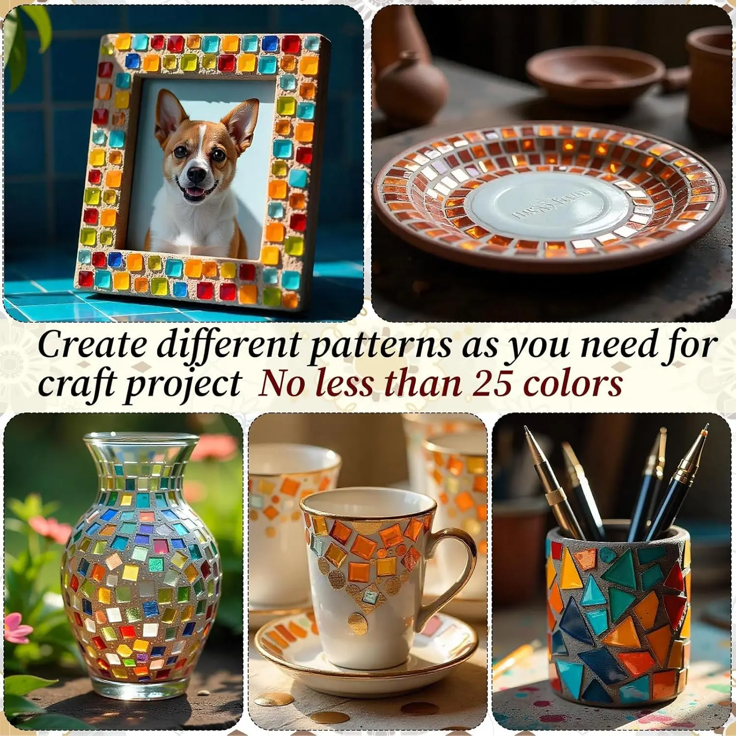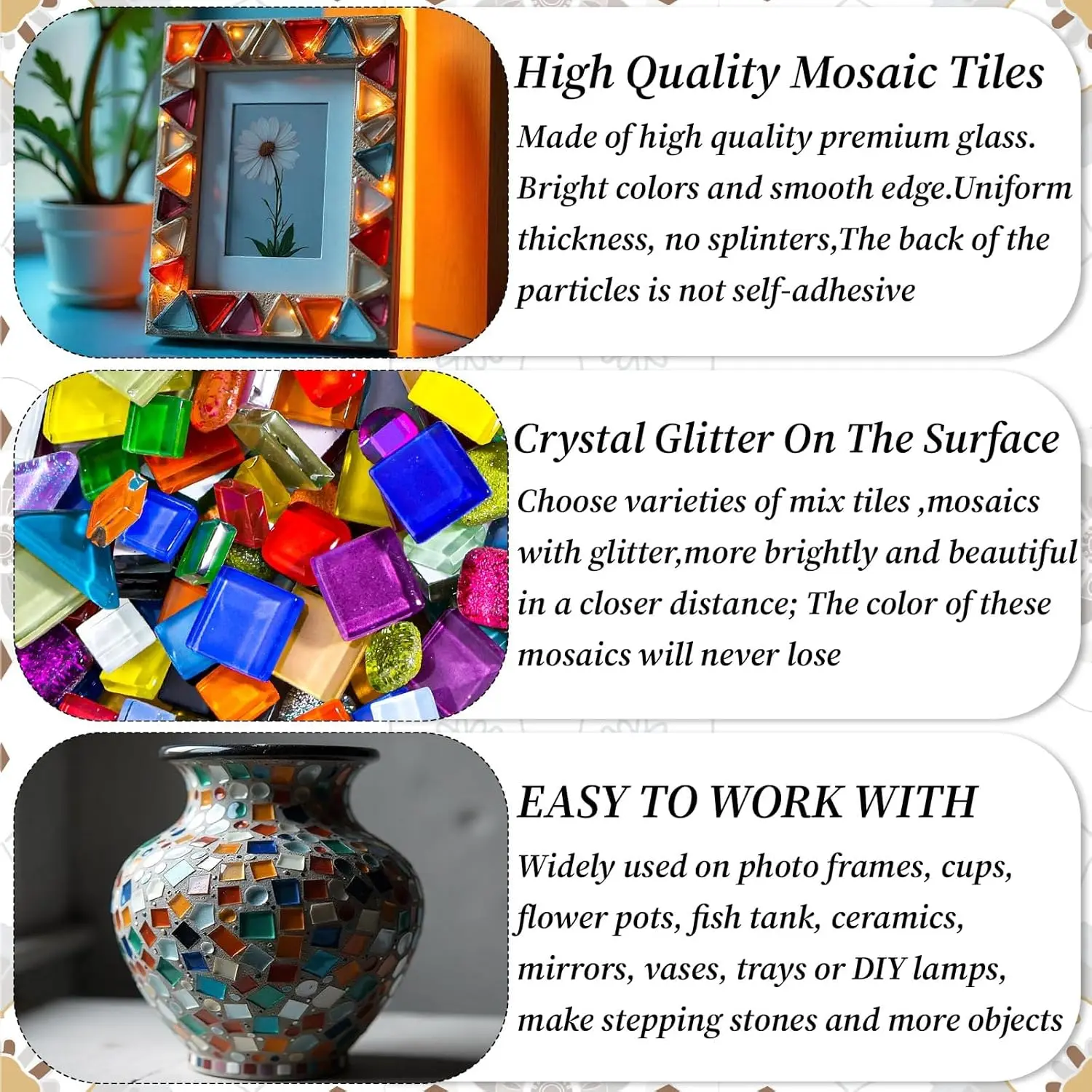 ·DIY Supplies: Our Mosaic tiles are perfect accessories for DIY projects. You can use your imagination and creativity to make every photo frame, plate, cup, mug, plant pot, etc. one-of-a-kind. Enjoy the fun of creating mosaic patterns with family and friends during weekend leisure time,enhancing family and friendship