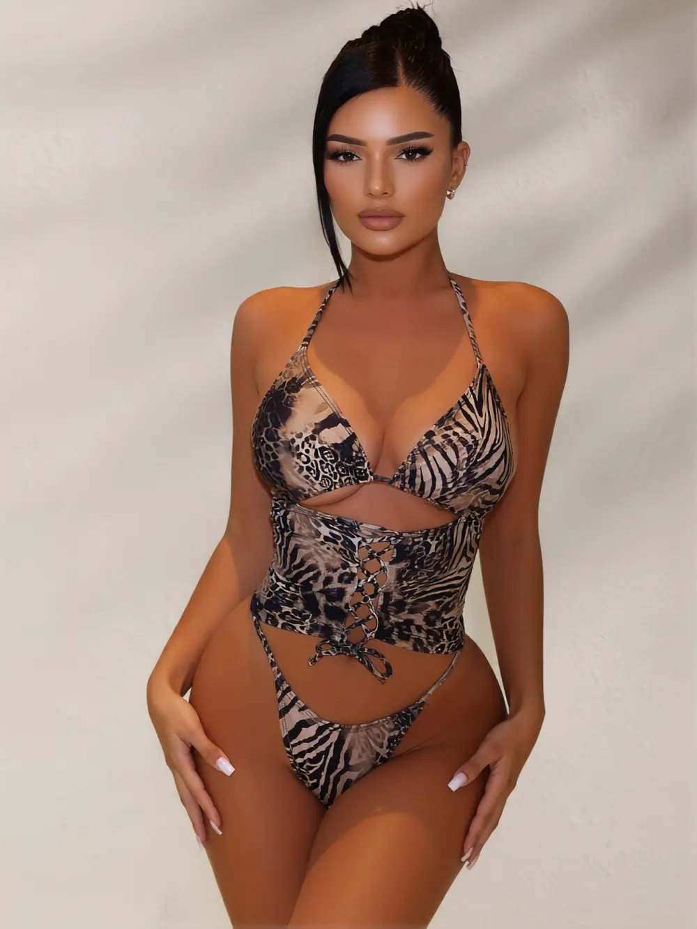 Women's New Solid Nylon Bikini – Sexy Leopard Print Color Block & Tie-Up Design