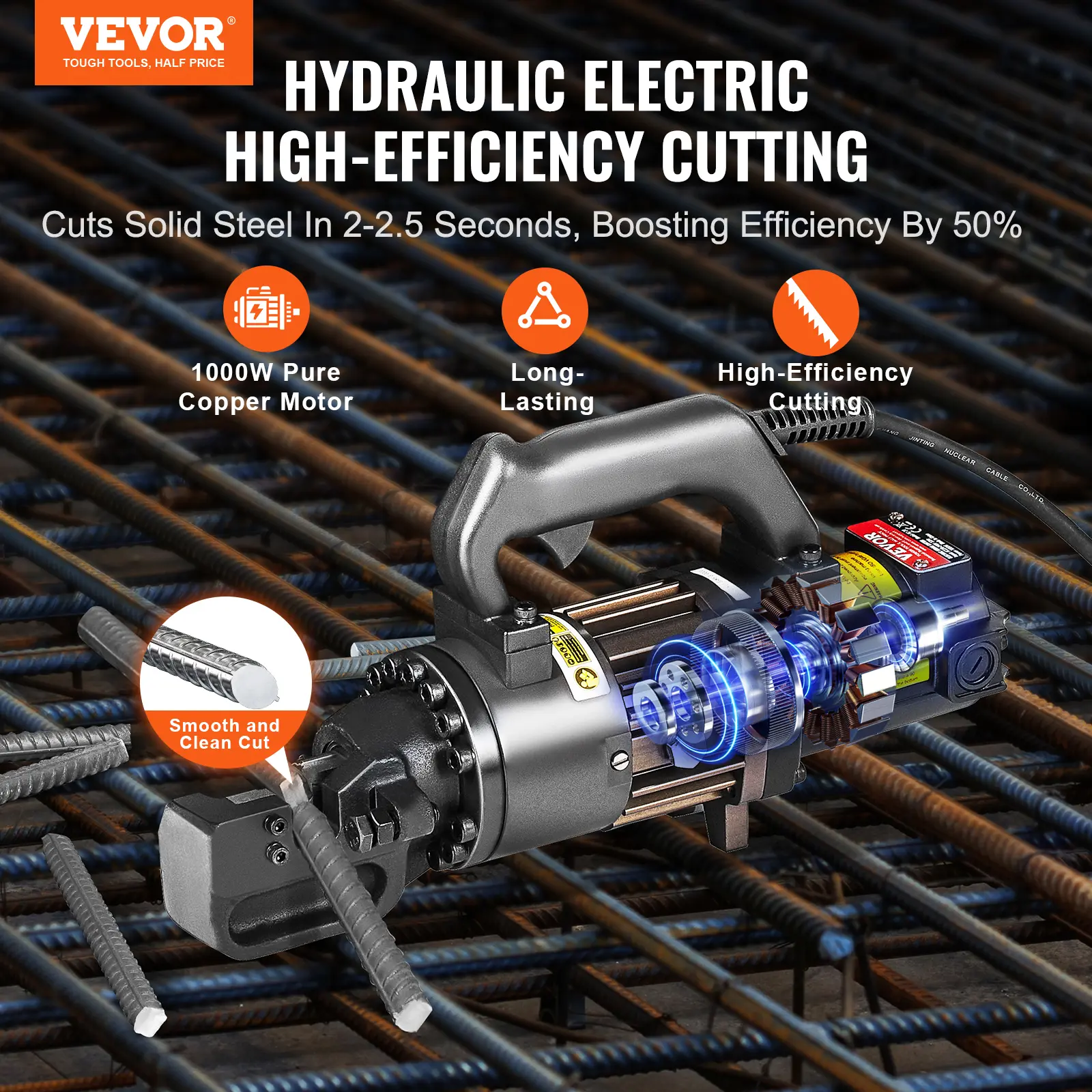 Fast Cutting: Hydraulic electric cutting rebar, able to accurately cut solid rebar in 2-3 seconds, the cutting surface is flat and smooth without burrs, 1000W pure copper motor strong power.