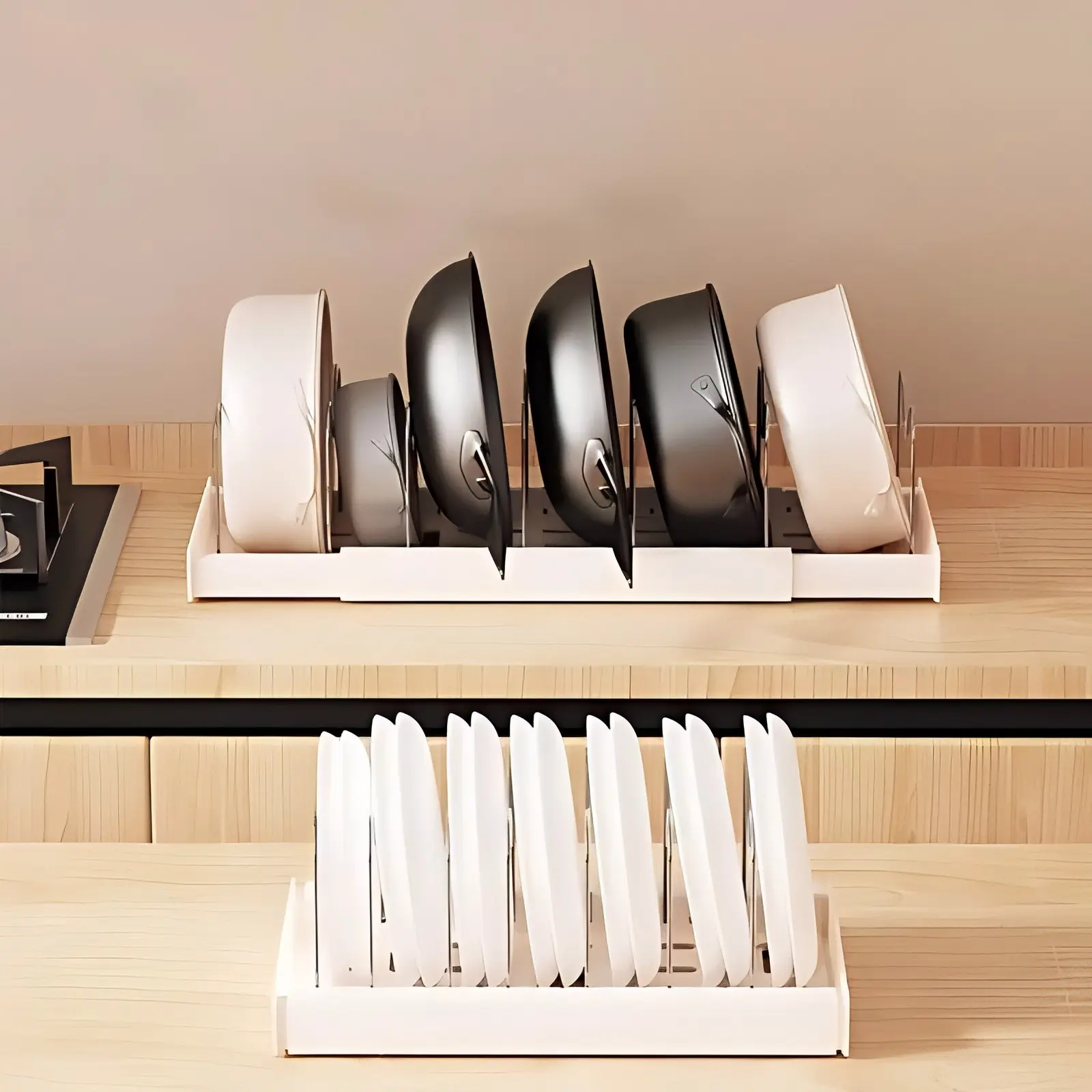 Expandable Pot and Pan Organizer Rack for CabinetOrganize your kitchen with this expandable pot and pan organizer rack, designed to keep your cabinets and pan lids tidy and easily accessible.Key Features:·Expandable Design: This rack can be expanded to accommodate more items, making it perfect for larger kitchens.