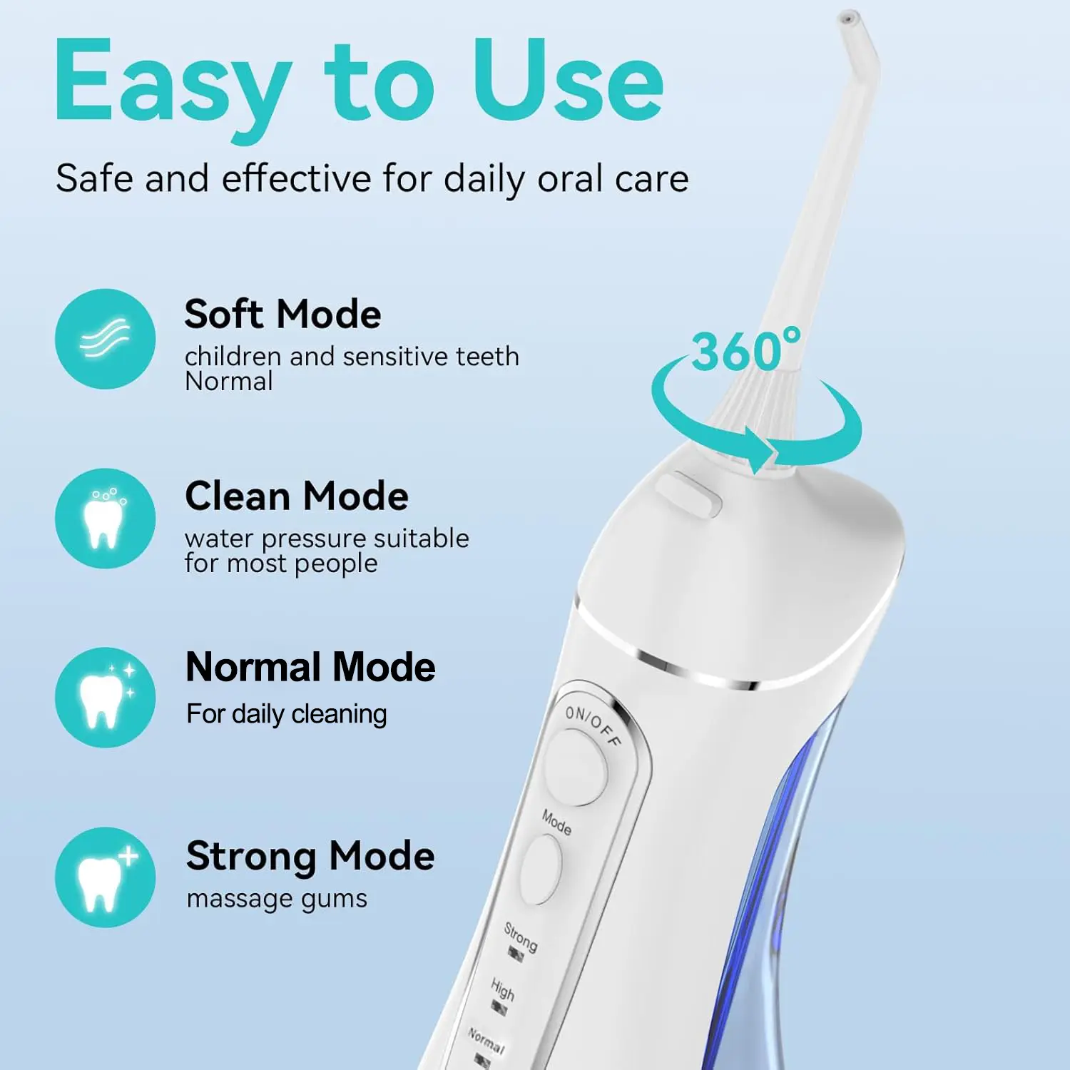 ·4 Adjustable Flossing Modes for Targeted Teeth Cleaning: This cordless water flosser provides four intensity settings (Soft, Normal, High, and Strong) to accommodate various oral care requirements ranging from sensitive gum care to orthodontic maintenance. The integrated memory-save feature retains your last selected mode, enabling direct activation upon the next use without manual adjustment and making the teeth cleaner easy to operate for adults and seniors