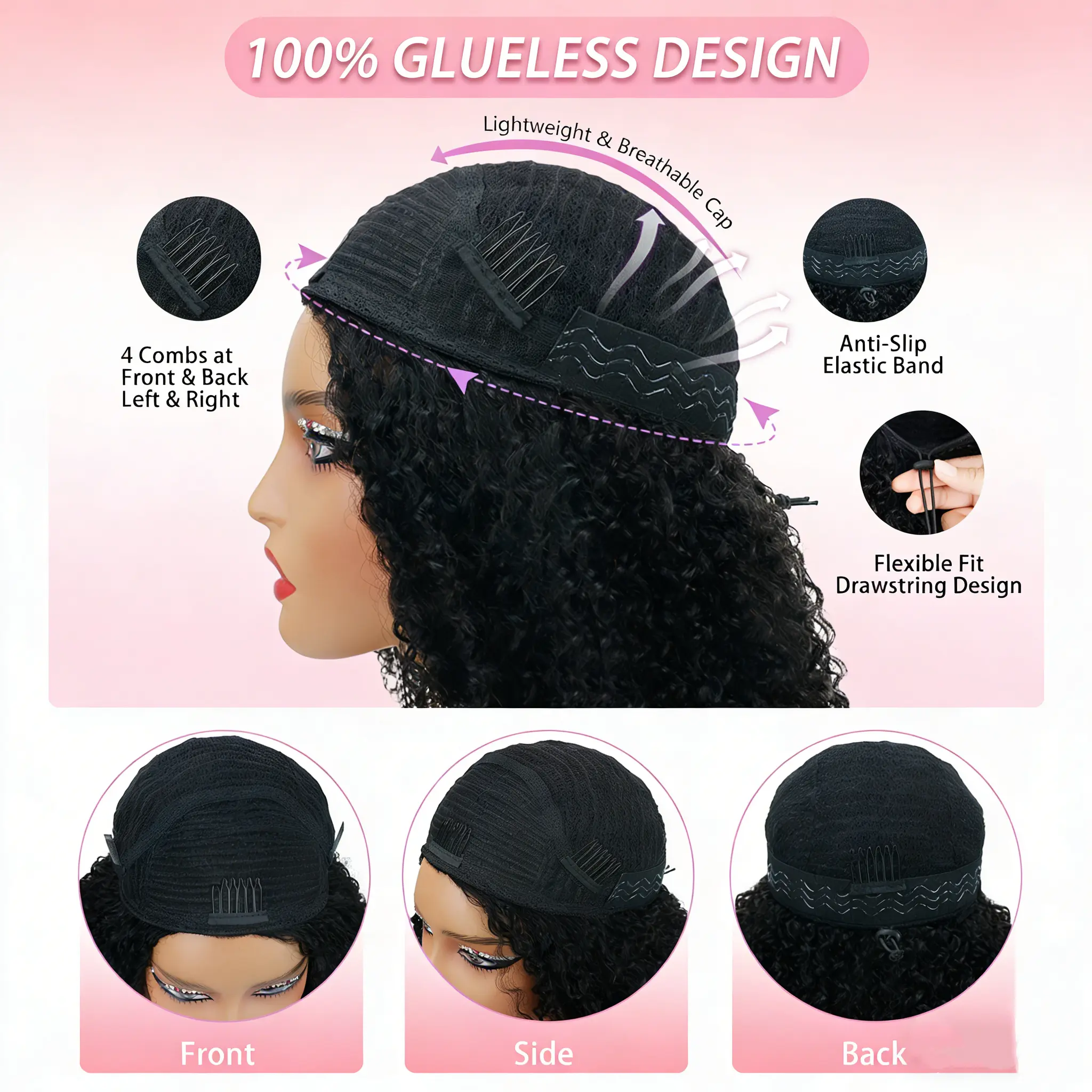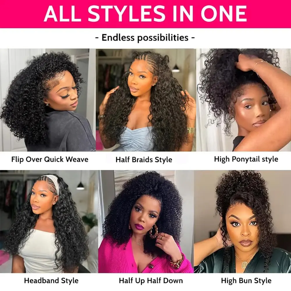 [3 IN 1 HALF] GOULUS Kinky Curly Half Wig Human Hair 200% Density 3 IN 1 Glueless Ready To Go Half Wig Human Hair With Drawstring Seamless Clip Ins Flip Over No Glue No Lace For Women Beginner Friendly