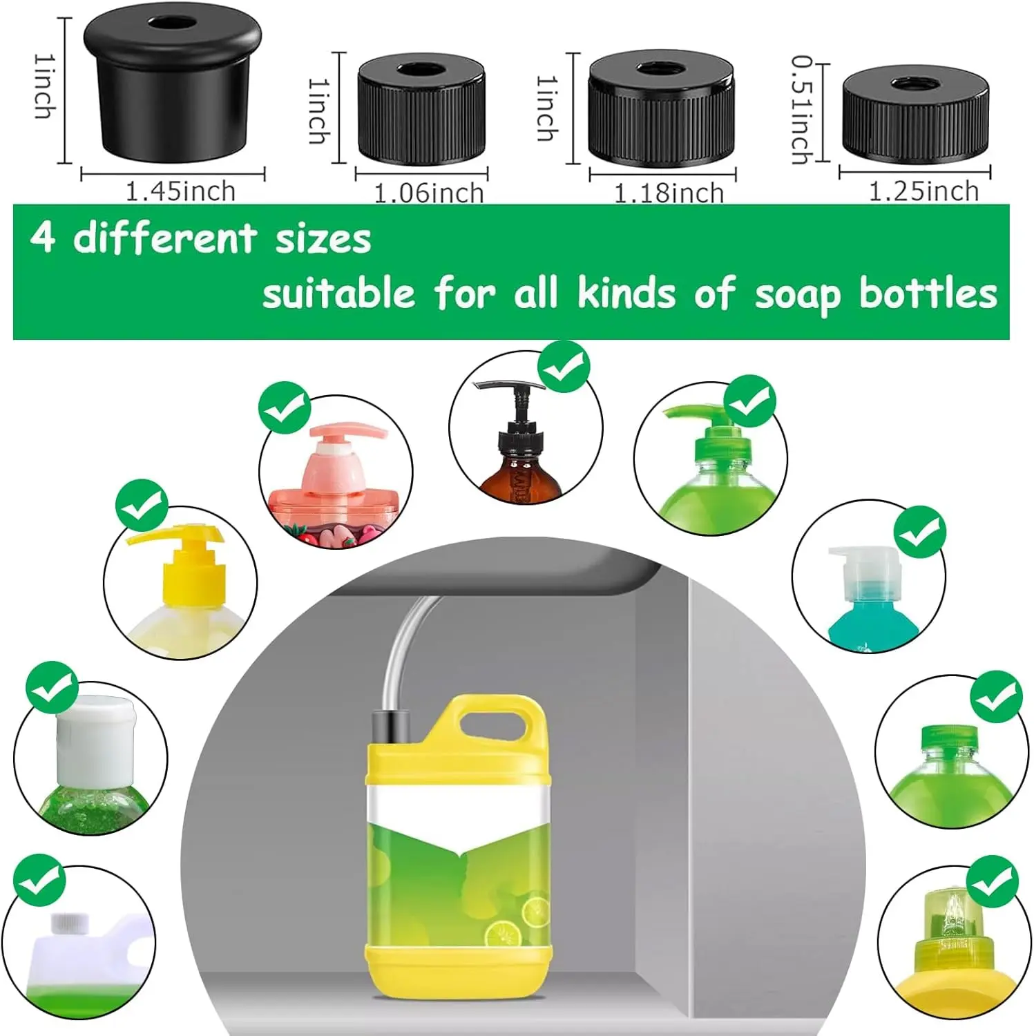 🧼 Comes with 3 multi-sized caps for soap container openings from ⌀14mm to ⌀31mm. Use a large dish soap bottle directly. No overflow worries. If the pipe is too long, cut it short for easier first use. Ensure your soap dispenser pump diameter matches.
