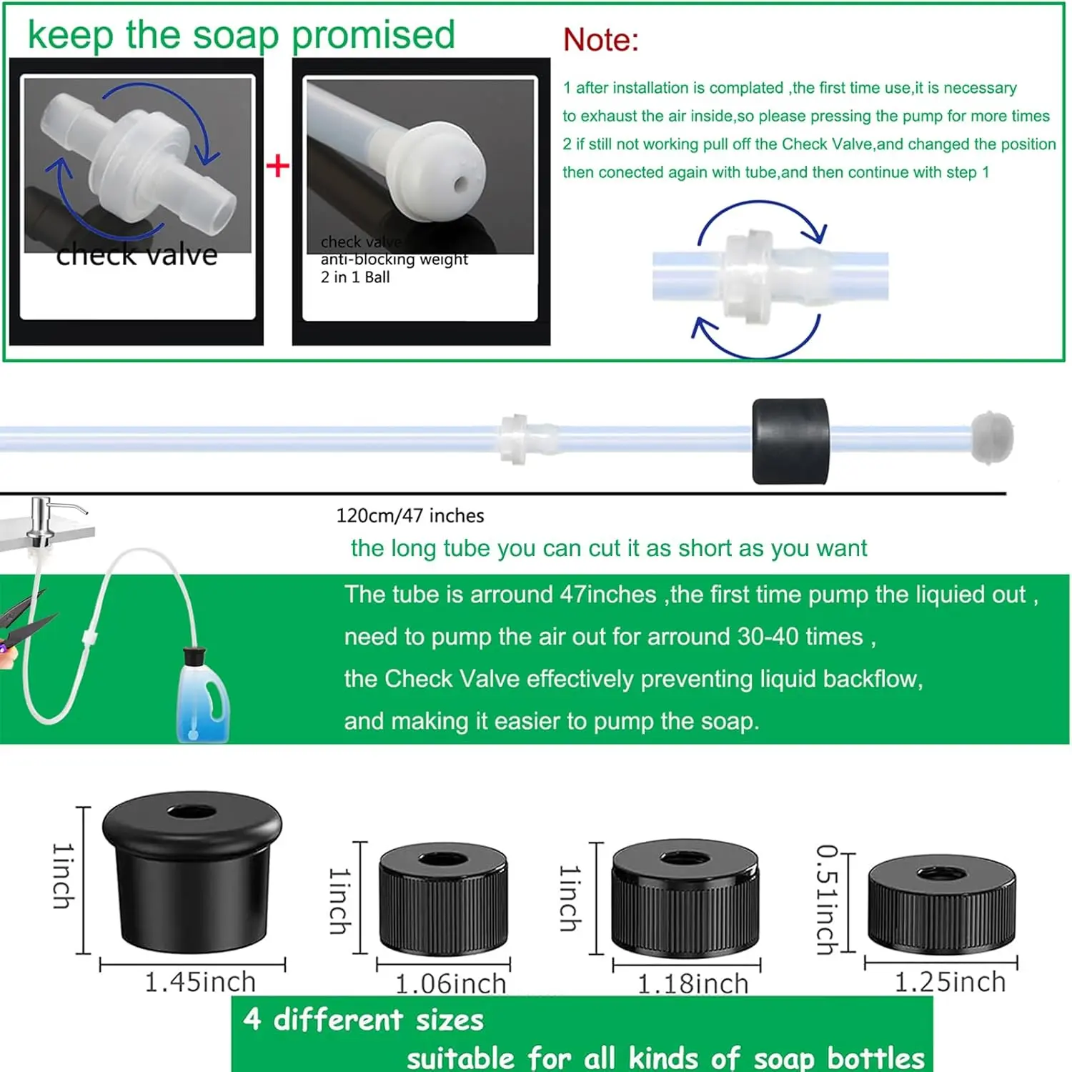 🔧 The first pump requires air at backflow for easier soap extraction. Made of food-grade silicone, 0.24" inner diameter fits most 0.28" sink dispensers. Extend 47" under the counter. If soap doesn't work, check valve installation may be wrong. Adjust as needed.