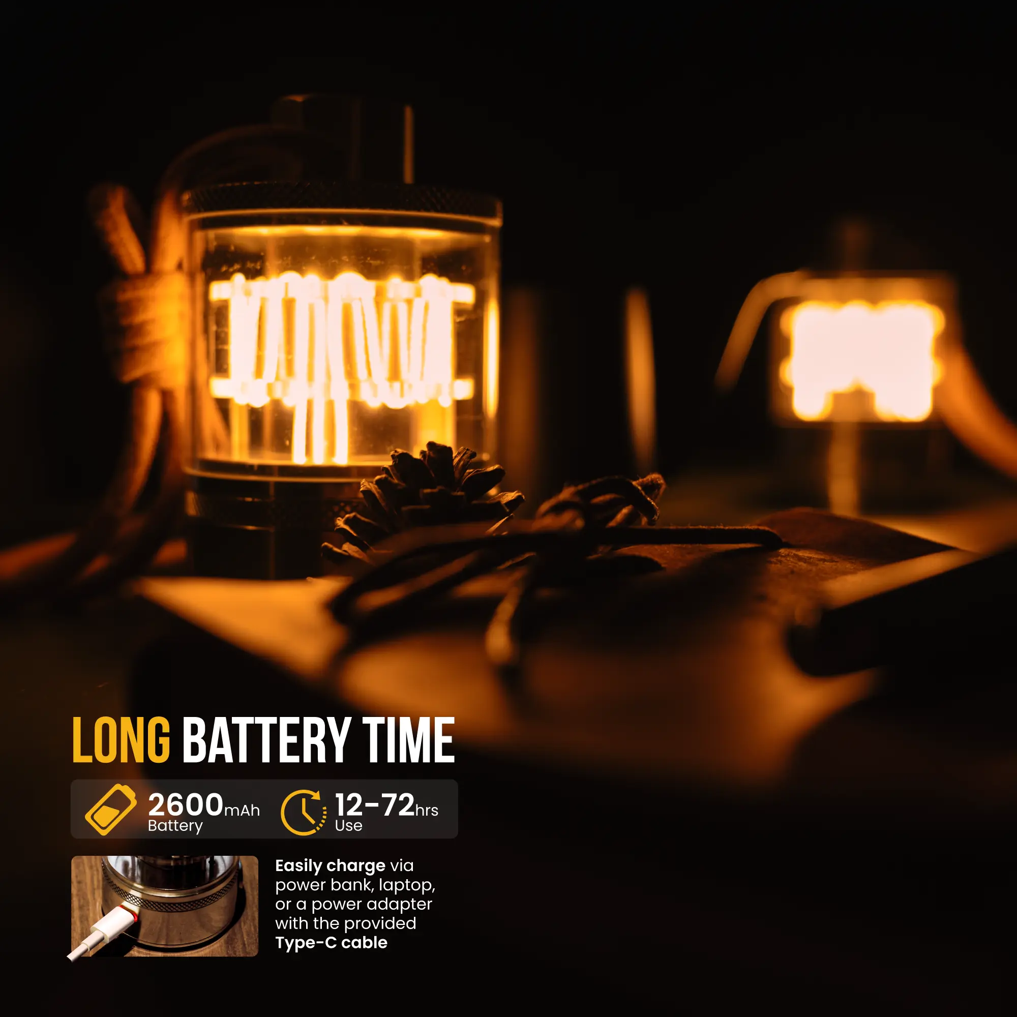 ·BUILT FOR THE LONG JOURNEY - This Φ 2.36" x H 3.94", 11 oz aluminum lantern combines precision engineering with intuitive function: smooth dimming controls (3-second fade), 72-hour max runtime (2600mAh via USB-C), and IPX4 splash resistance. The perfect balance of trail-ready durability and home-friendly ambiance—whether illuminating backcountry campsites or weathering urban power outages