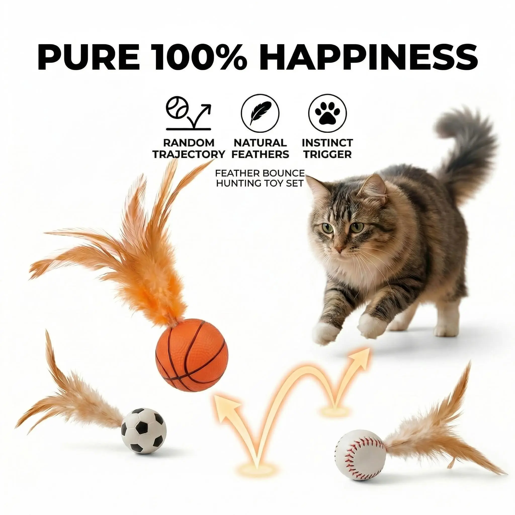 6-Pack Feather Bounce Cat Toys – Interactive Springy Balls for Cats, Basketball/Soccer/Baseball Designs with Soft Natural Feathers, Solo-Play Toys to Activate Hunting Instinct, Relieve Boredom & Anxiety, Safe Durable for Kittens & Adult Cats
