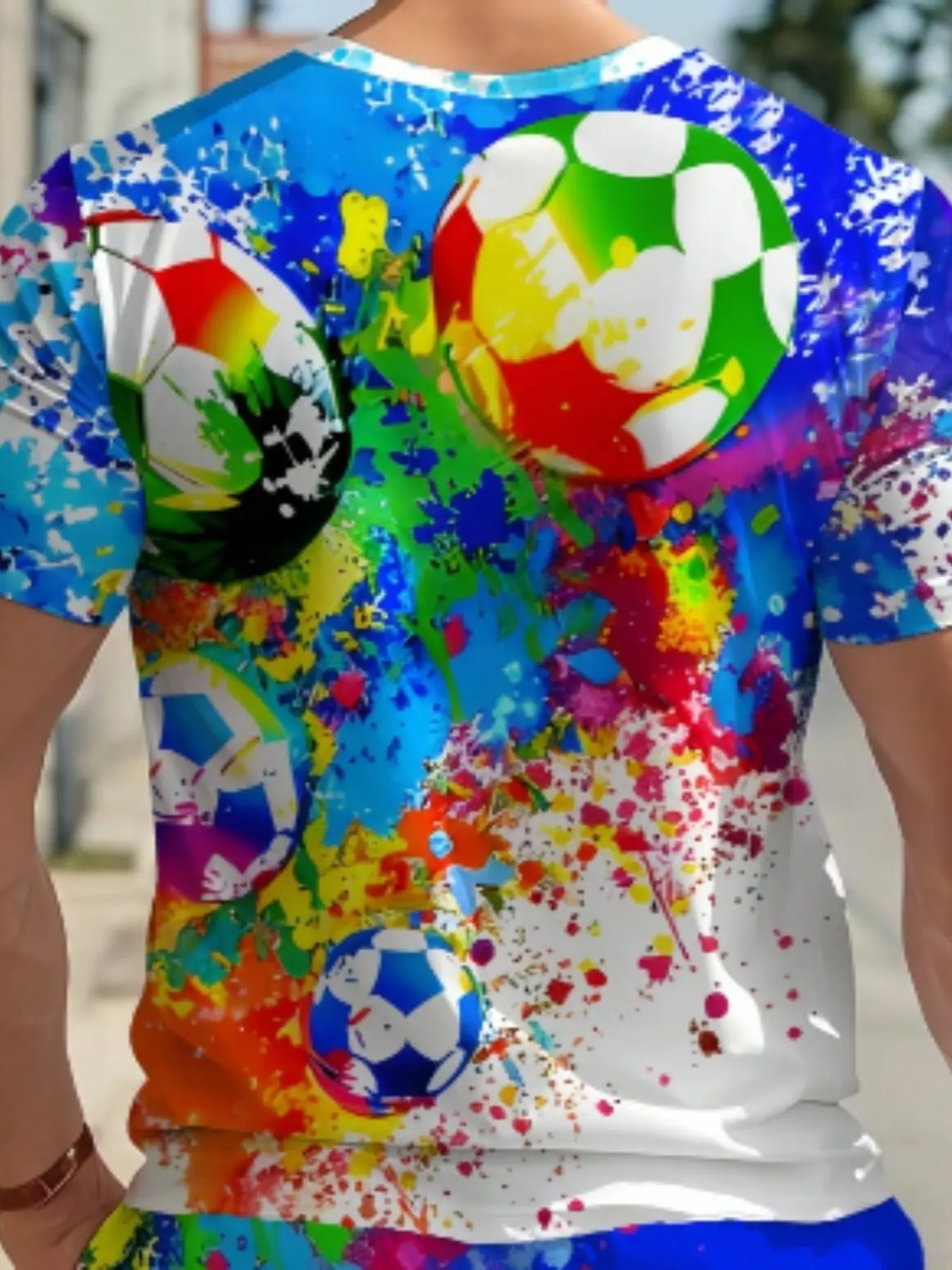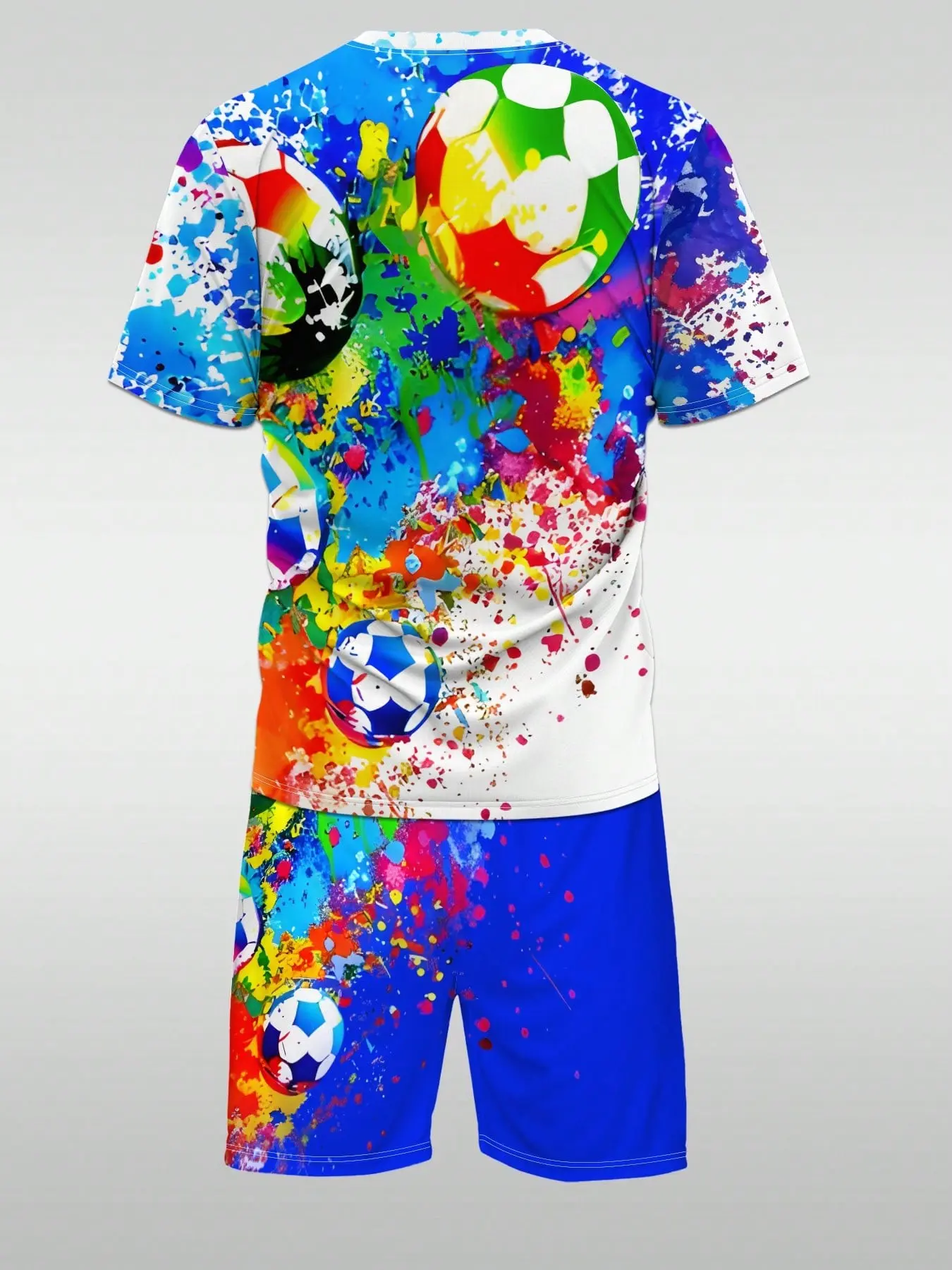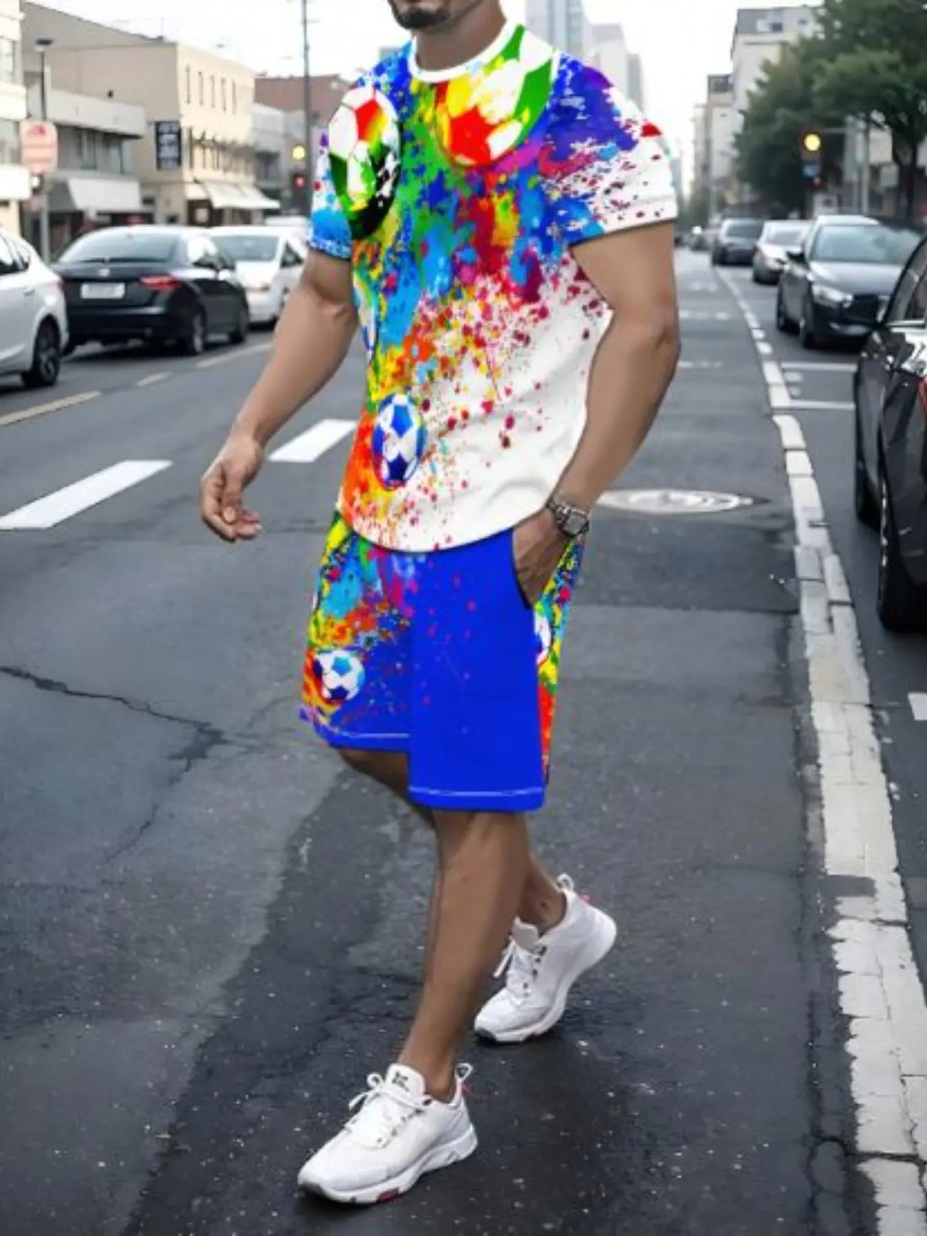Summer 2-Piece Set for Men, Casual Patchwork T-Shirt & Shorts, Short Sleeve, Above the Knee, All over Print, Perfect for Summer