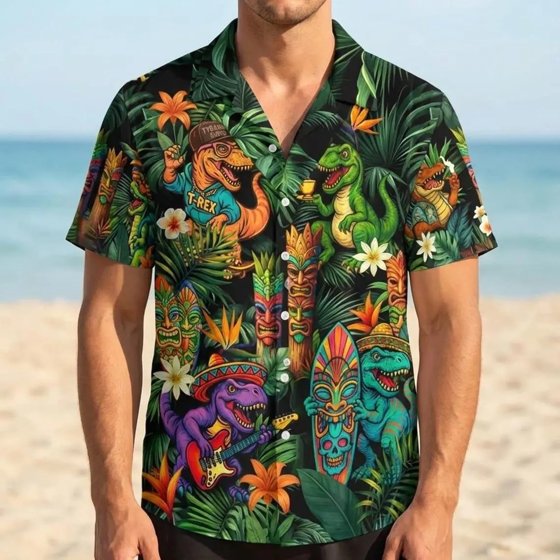 Tropical Dinosaur Tiki Hawaiian Shirt Mens, Beach Vacation Shirt, Gift for Dad, Summer Outfit, Tiki Shirt, Dinosaur Shirt, Dinosaur Gift