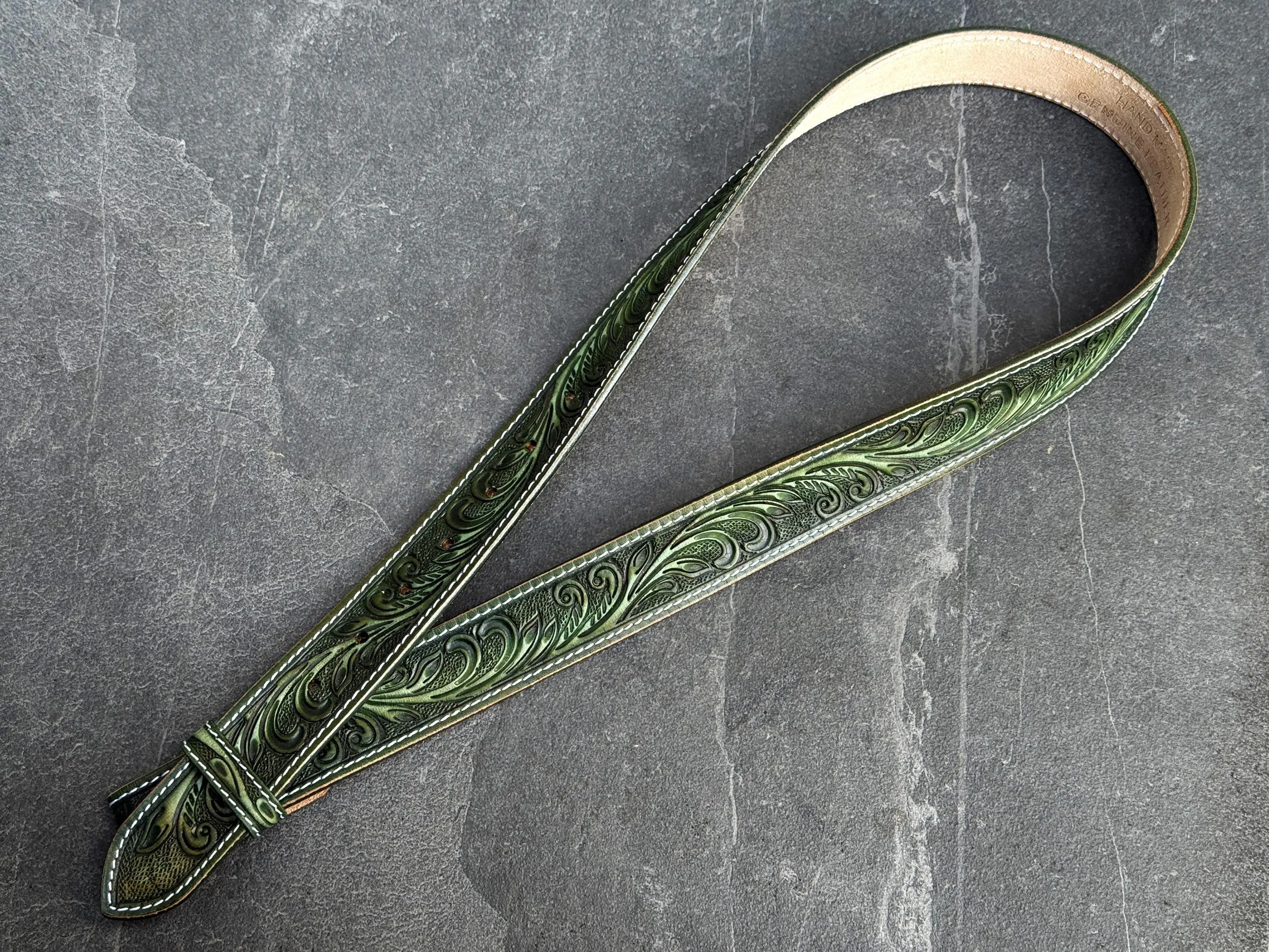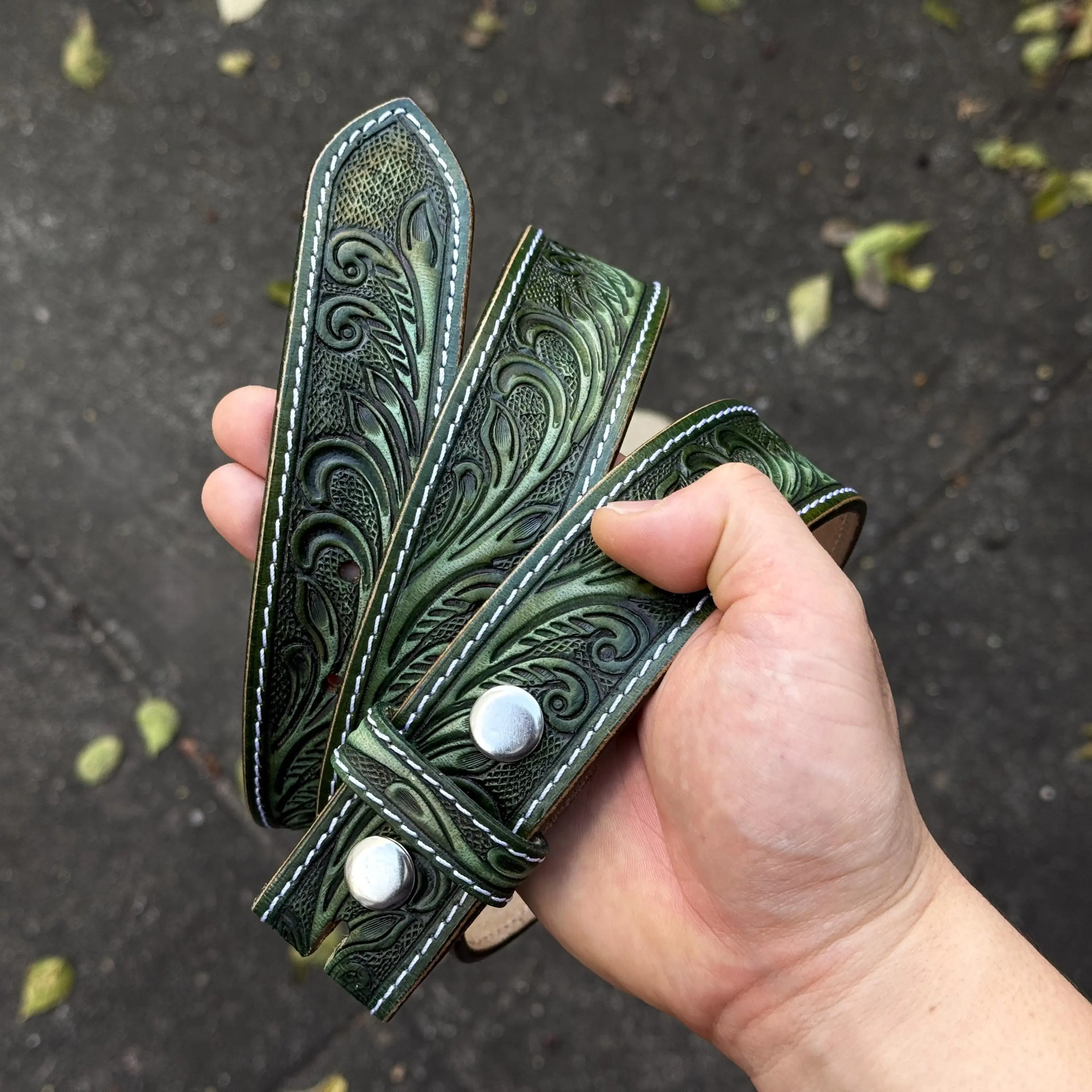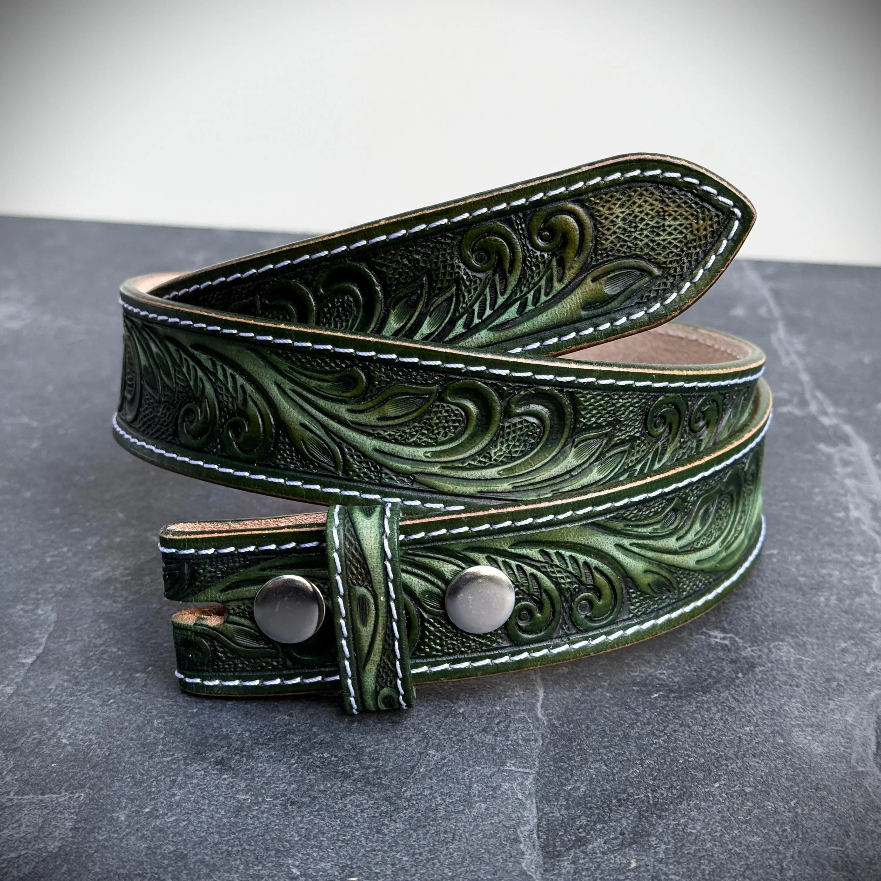 Personalized Floral Western Green Strap Belt Handmade Full Grain Leather Snap-On Design No Buckle Embossed Belt Father's Day Gift