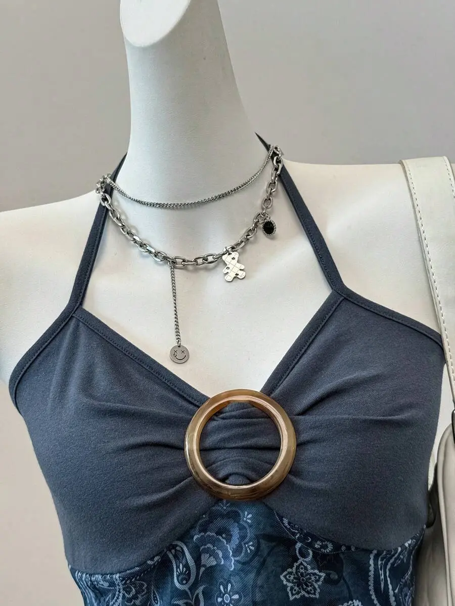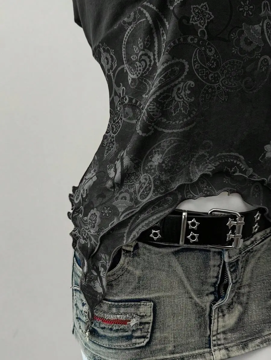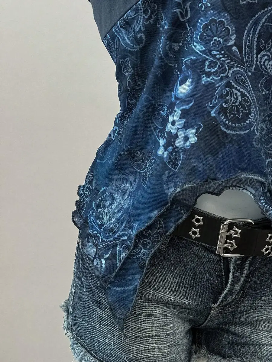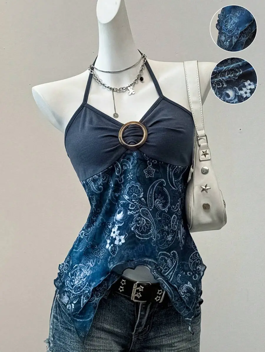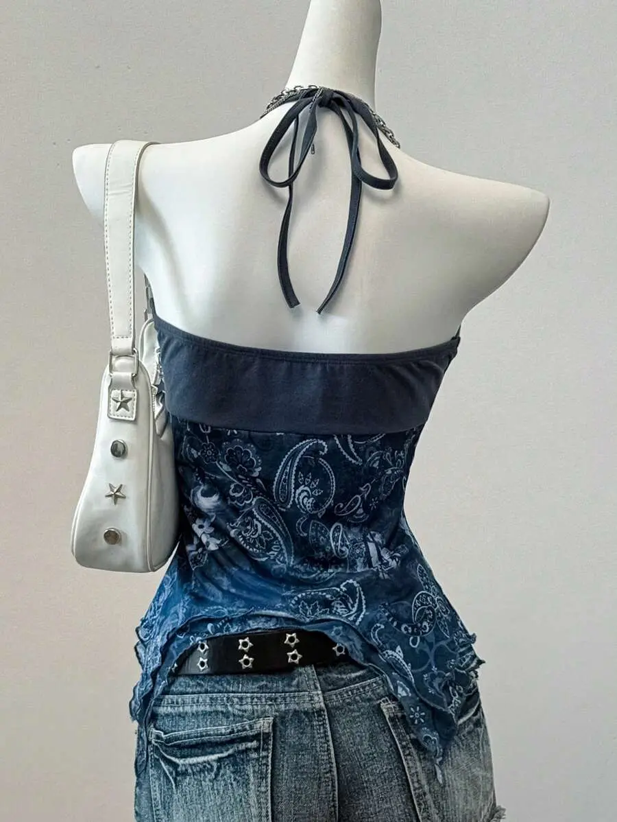 SOLEMN Summer Country Concert Retro Print Mesh Backless Halter Neck Top