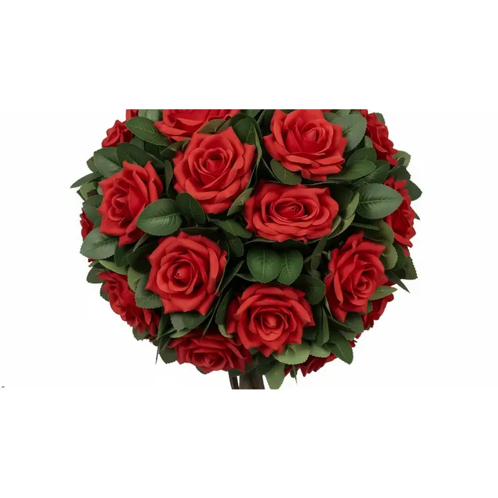 Standing tall with a gracefully sculpted stem, this piece features a lush, full sphere of rich green foliage delicately accented with vibrant red roses—creating the perfect balance of nature-inspired beauty and modern décor.