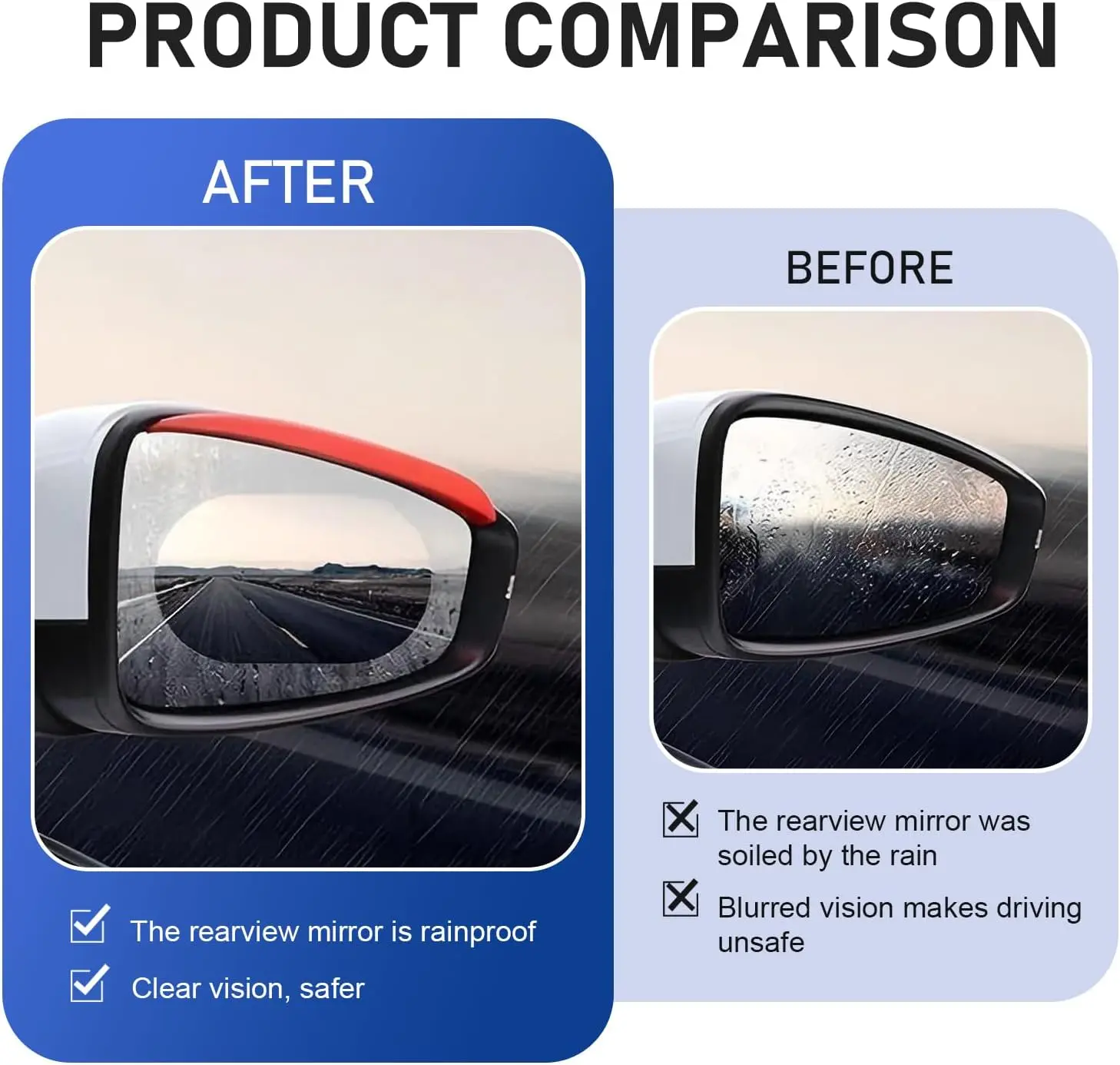 ·Enhance Driving Experience: With these car mirror stickers, you can always maintain a clear mirror surface. They effectively prevent raindrops from obscuring your vision, allowing you to focus on the road ahead. This not only improves your driving safety, but also greatly enhances your overall driving experience, making every journey more comfortable and enjoyable.