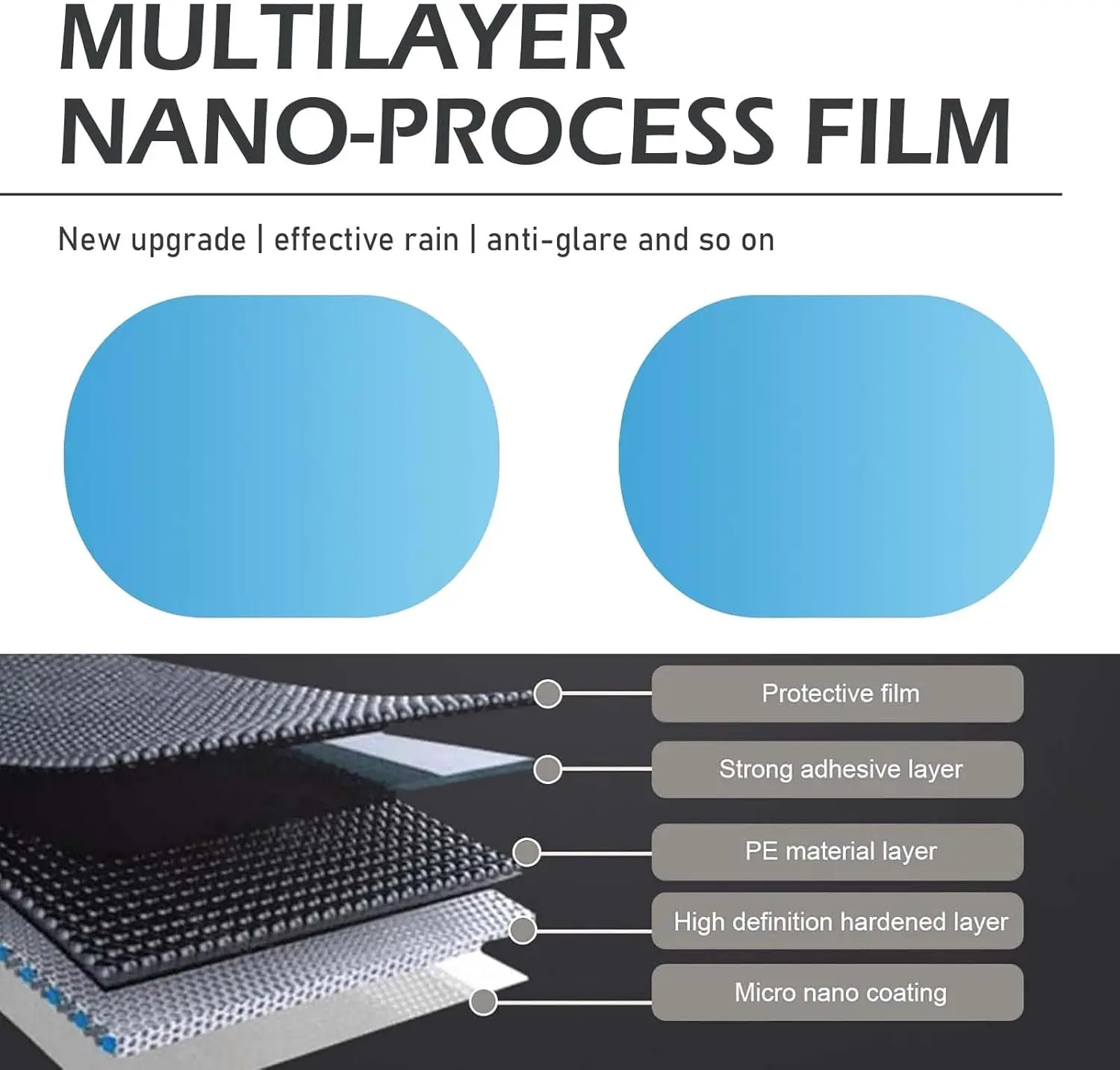 ·PET Material: This rainproof waterproof film is made of PET material with excellent heat resistance and durability, its excellent transparency and optical properties greatly improve driving visibility. It has a high light transmittance, which effectively reduces glare and anti-glare reflections, reducing visual fatigue during long-distance driving.